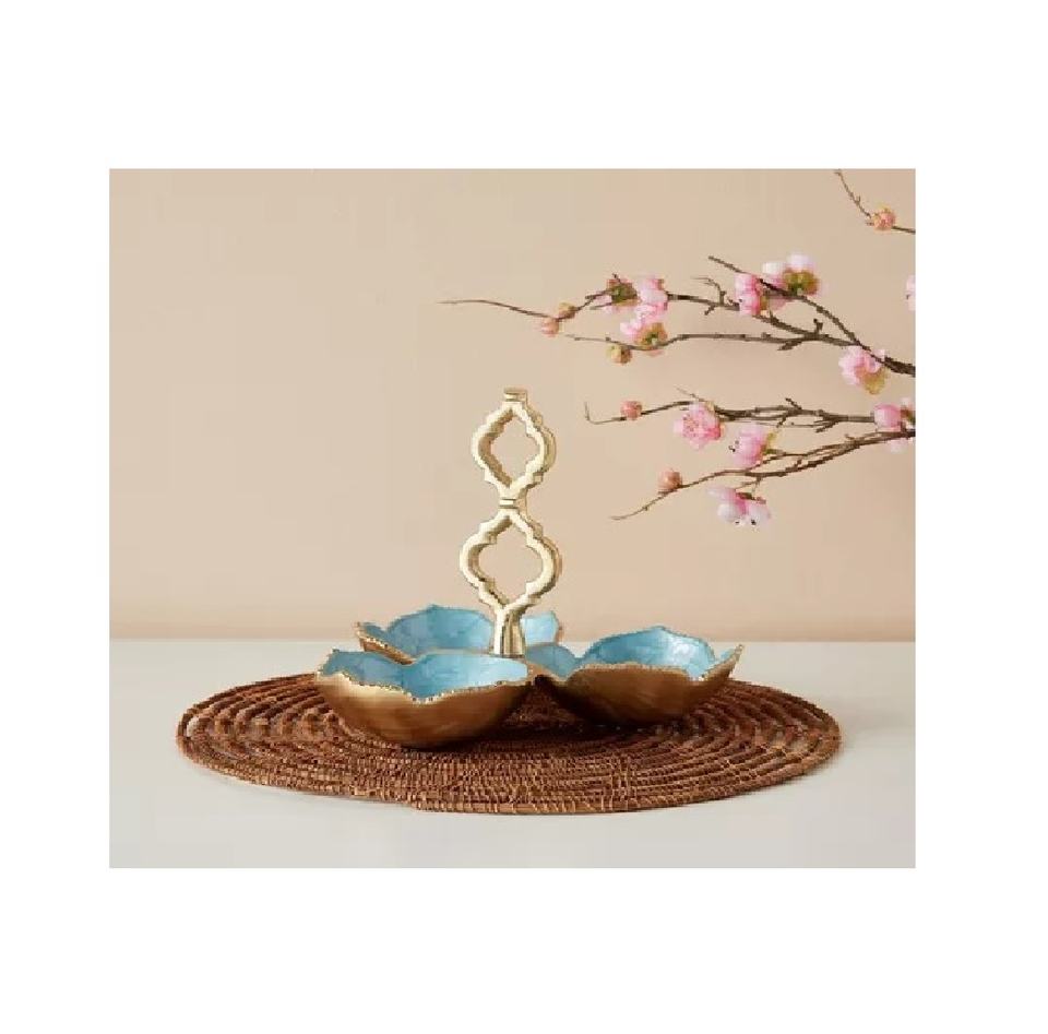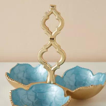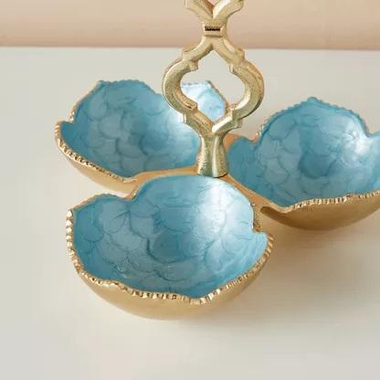ชามใส่เครื่องปรุงเคลือบ3ส่วนสีเทอร์ควอยซ์เคลือบอลูมิเนียมชามใส่เครื่องปรุงชุบทองทันสมัยชามใส่ผลไม้รูปลักษณ์ใหม่ทำด้วยมือ