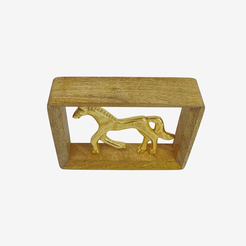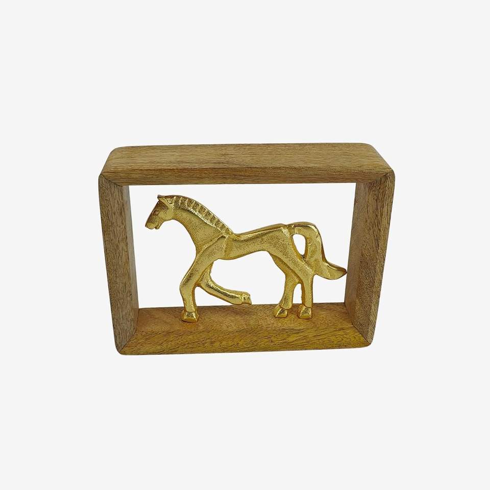 Aluminum horse Figure in Wooden Square, Artistic Ornament Sculptures, Unique Home Decor Showpiece for Living Room
