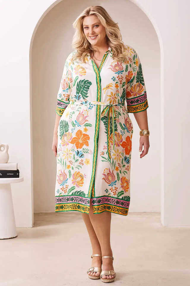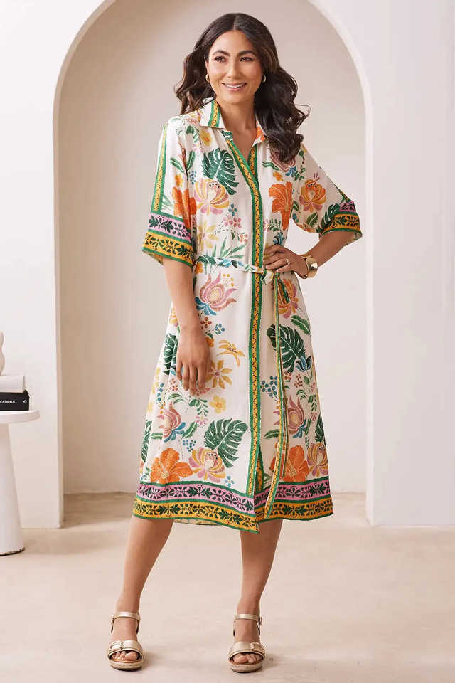 เดรสลายดอกไม้สไตล์ลำลองสำหรับวันหยุดพักผ่อน แขนสั้น ความยาวปานกลาง ผ้าเรยอน นุ่มสบาย