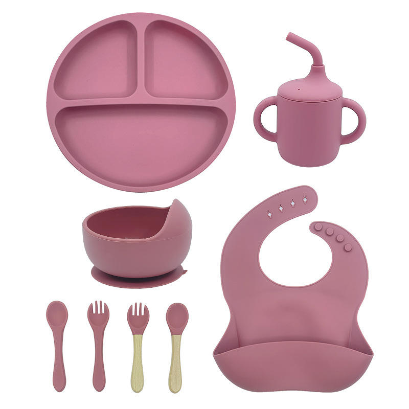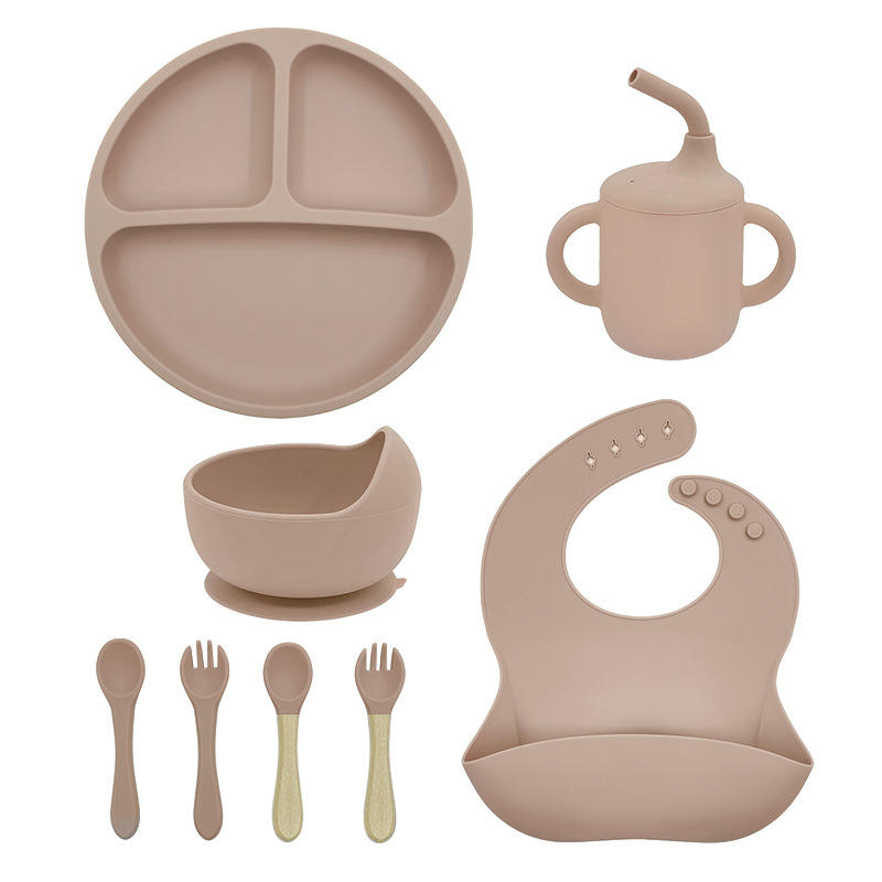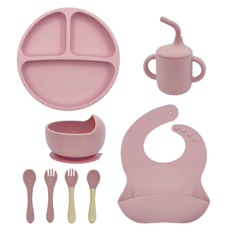 Am azon ชุดป้อนอาหาร8ชิ้นสำหรับเด็กวัยหัดเดินชุดจานชามซิลิโคนดูดไร้สาร BPA ออกแบบโลโก้ได้ตามต้องการ