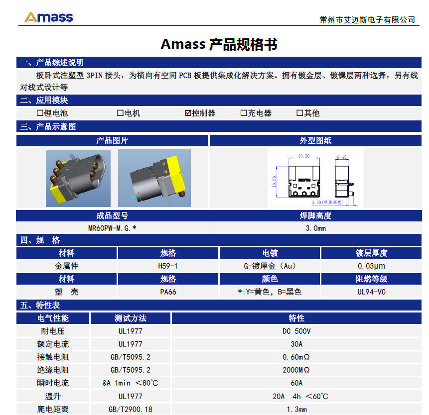 เต้ารับไฟฟ้าแบบติดตั้งบนแผงวงจรพิมพ์ทองเหลือง Amass MR60 ซีรีส์ แนวตั้งแนวนอน 30A-60A กระแสสูง พร้อมปลั๊กในตัว สำหรับสายไฟมอเตอร์ ESC โดรน