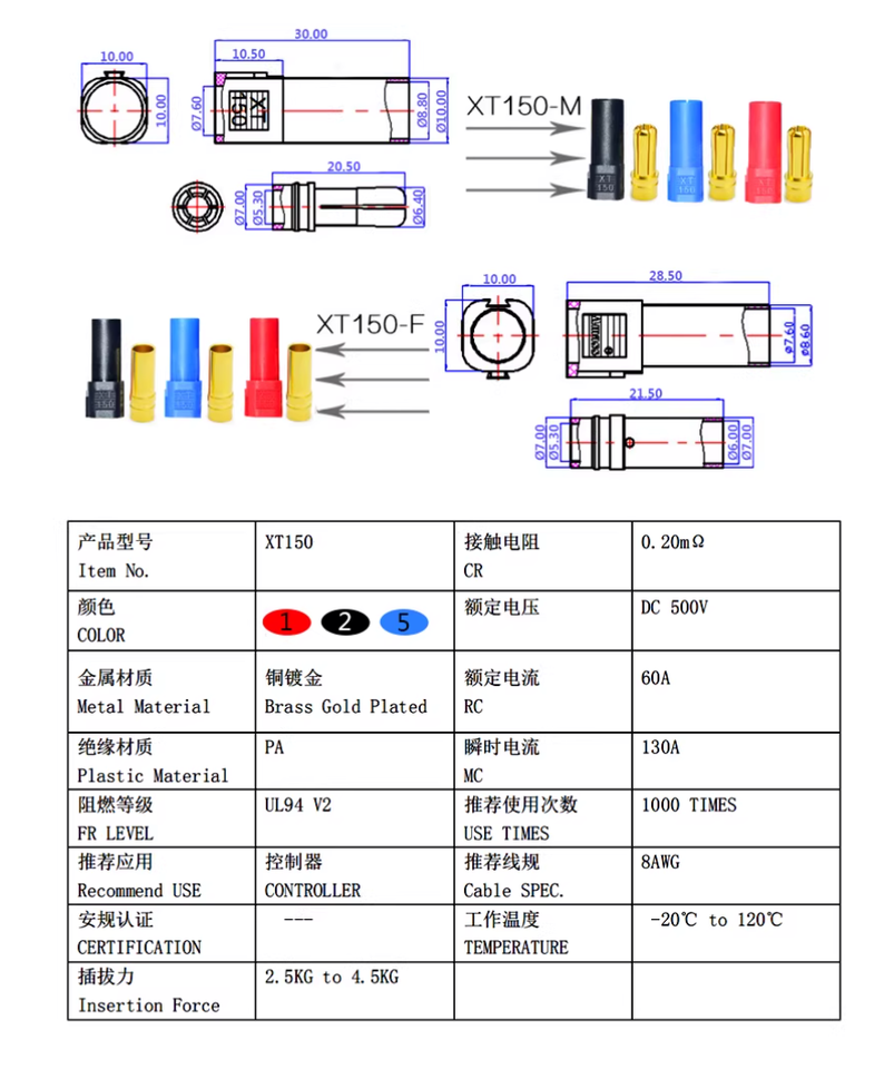อะแดปเตอร์ขั้วต่อไฟฟ้ากำลังสูง Amass XT150 แบบทองแดง ตัวผู้/ตัวเมีย พร้อมปลอกป้องกัน ขนาด 6 มม. หัวปลั๊กชุบทอง สำหรับทดสอบแบตเตอรี่ RC