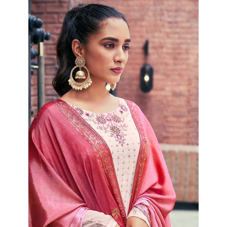 ชุดปาเลซซาลวาร์สำเร็จรูปสไตล์บอลลีวูดแบบปากีสถาน ผ้าจอร์เจตต์ปักลายสีเบจสวยงาม เหมาะสำหรับงานเทศกาลและชุดประจำชาติ