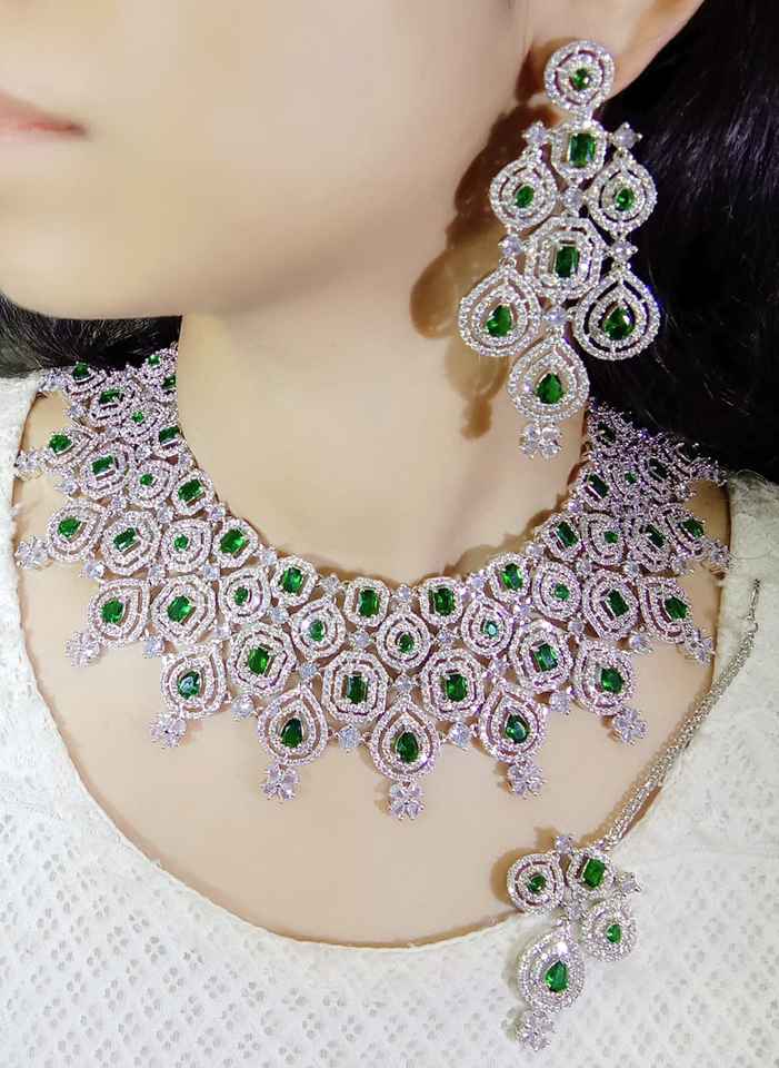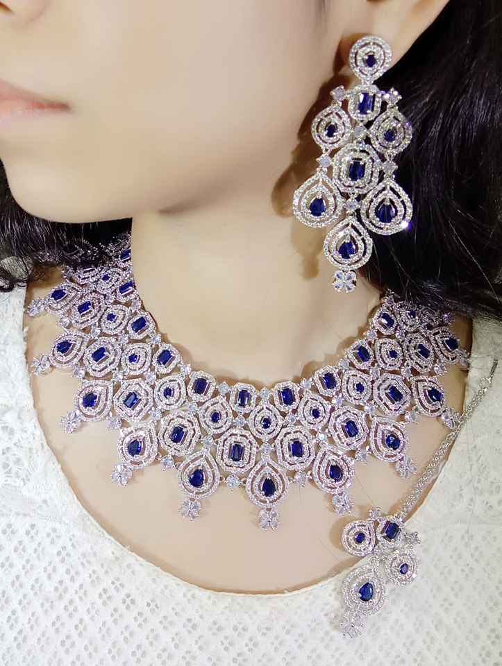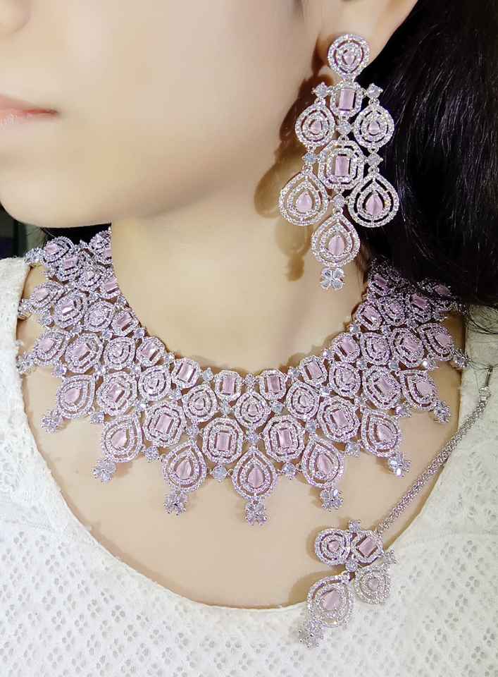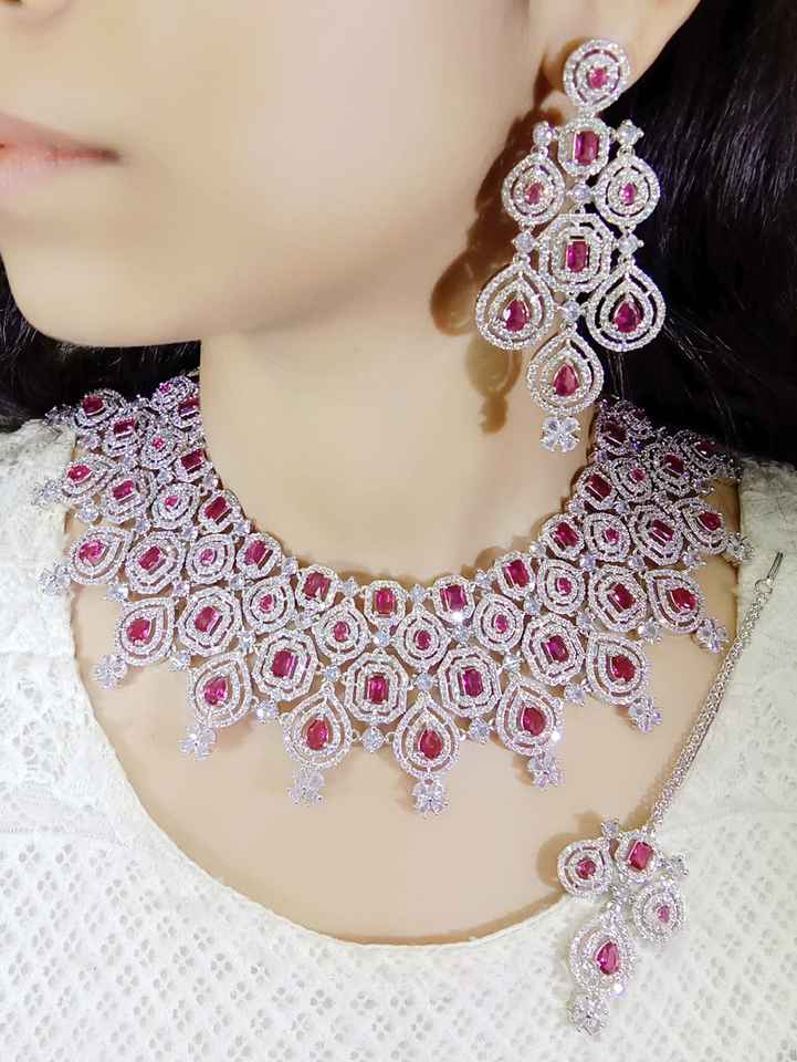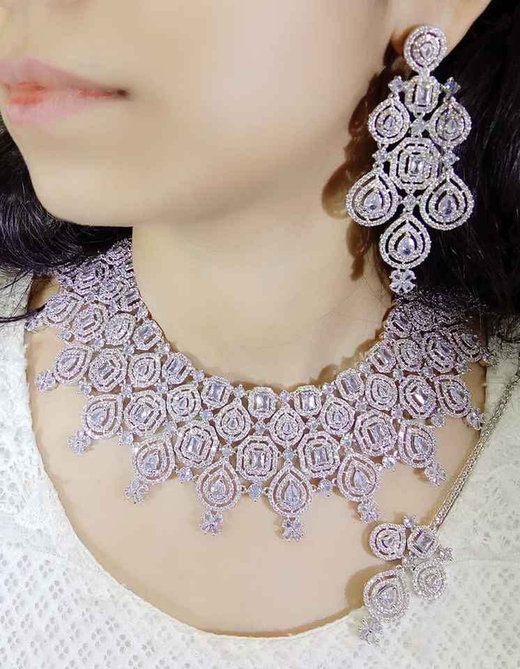 ชุดสร้อยคอชุบเพชรที่น่าตื่นตาตื่นใจเครื่องประดับสำหรับเจ้าสาวที่มีหินกลมและหยดน้ำตาสวมใส่ในงานปาร์ตี้ที่สง่างาม