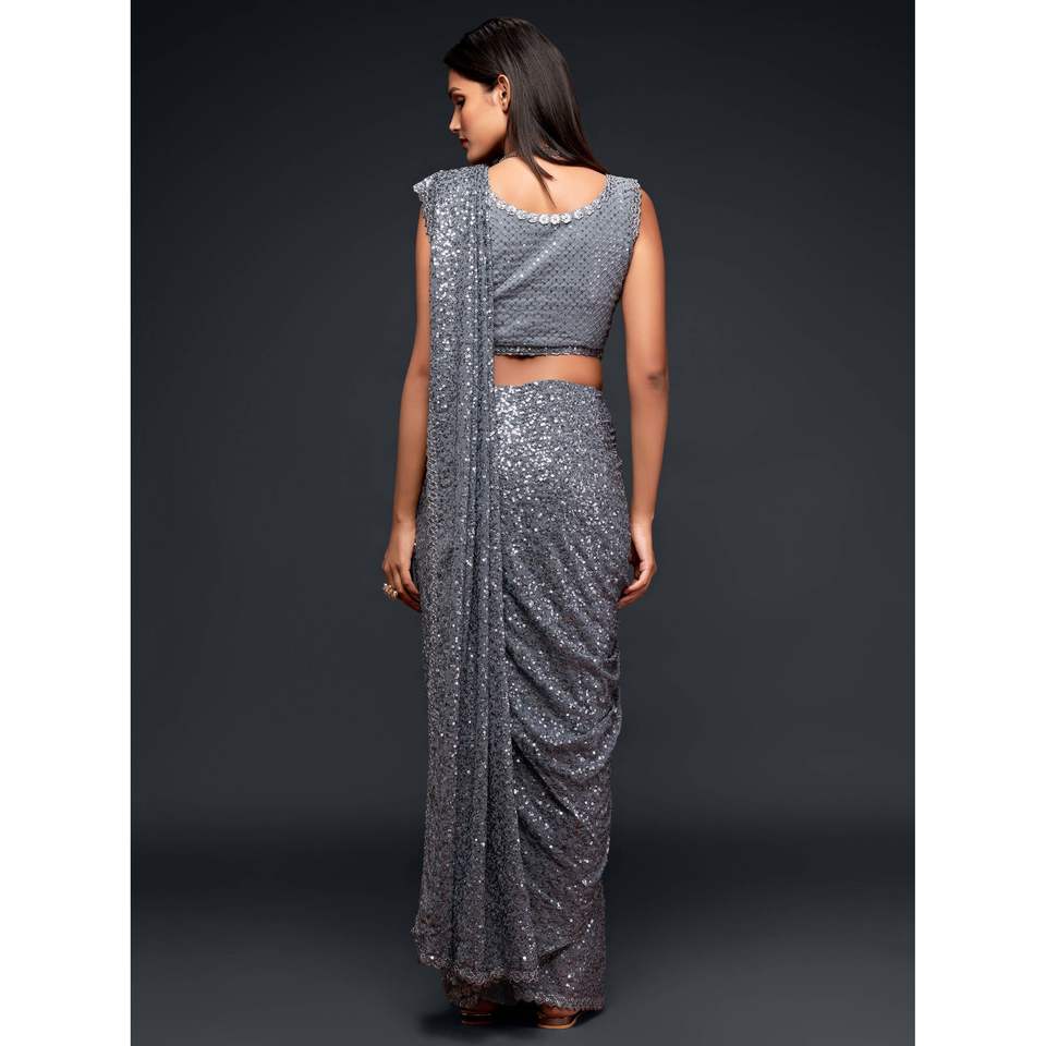 ชุดปาร์ตี้ผ้าจอร์เจียประดับด้วยเลื่อมสีเทาหินชนวนที่น่าตื่นตาตื่นใจ