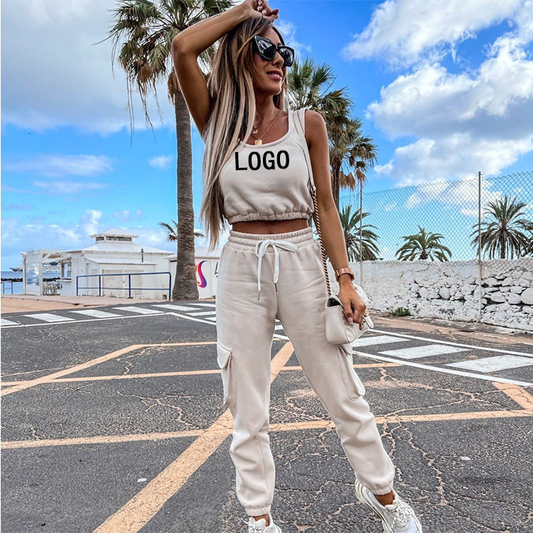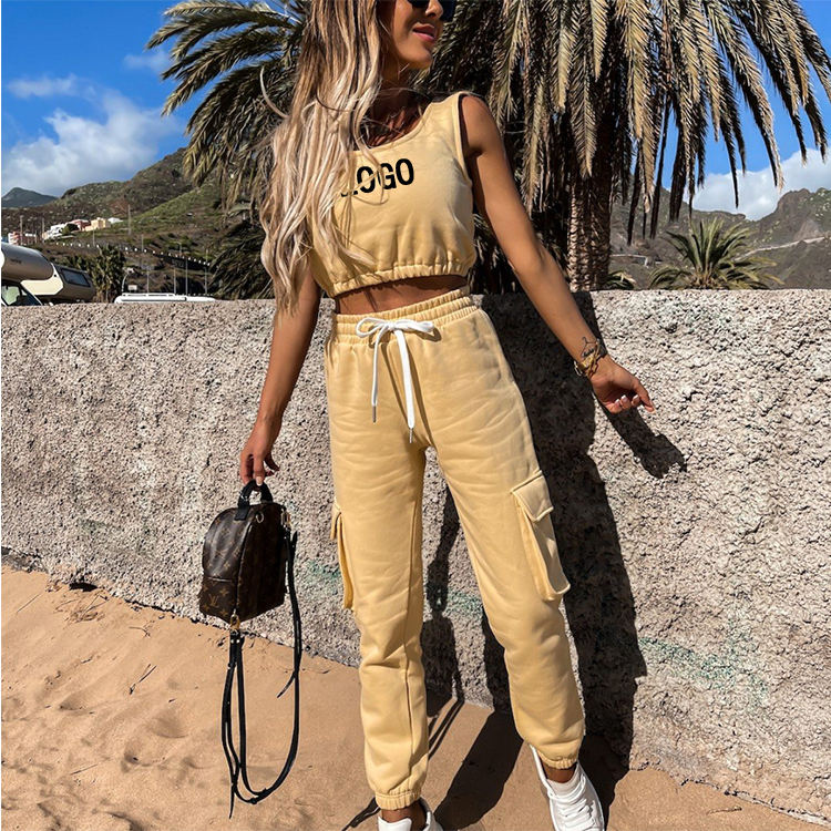 ชุดเสื้อครอปโชว์ไหล่และกางเกงจีบสำหรับผู้หญิง,เสื้อครอปแขนกุดแบบลำลองชุดนักวิ่งโลโก้แบบกำหนดเองสำหรับกีฬา