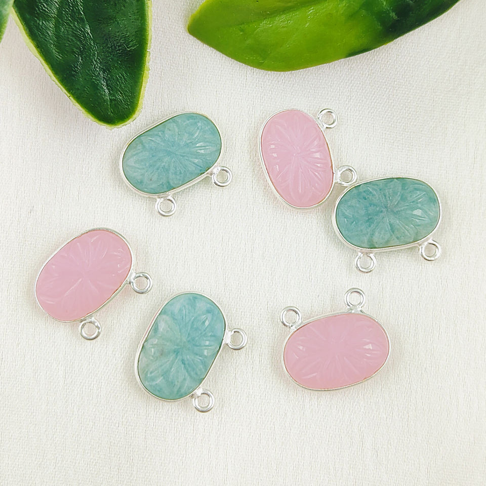 จี้สร้อยคออเมซอนไนต์แกะสลักแบบห่วงคู่รูปดอกไม้สีชมพูพร้อมสีทองรูปวงรีจี้เงินและเสน่ห์