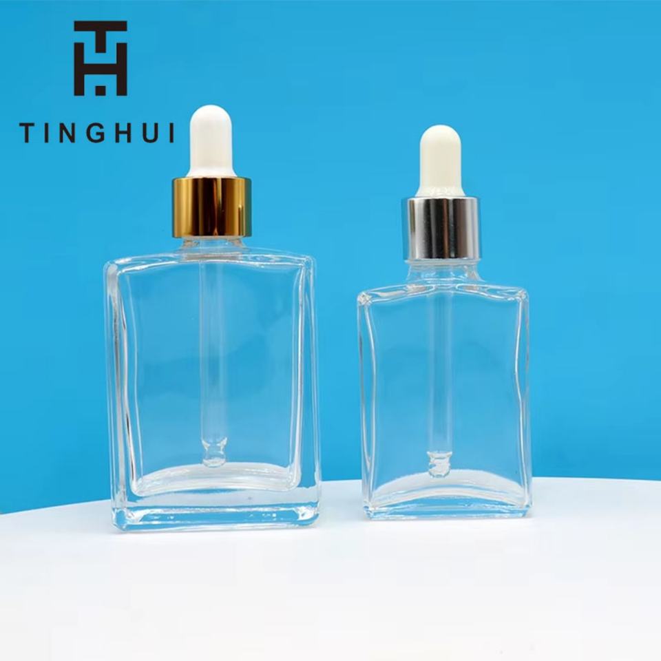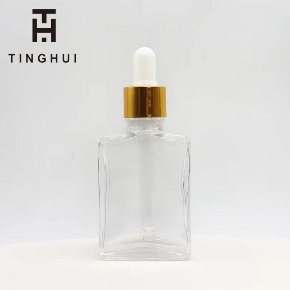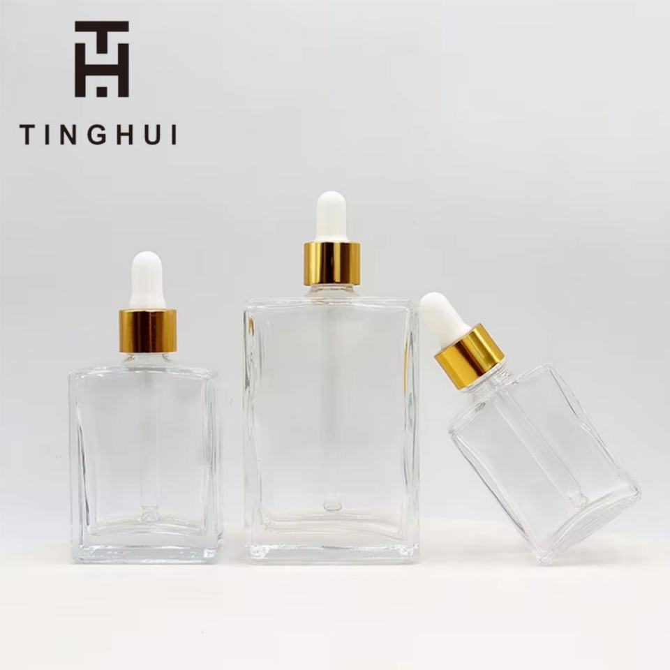 ขวดแก้วสีน้ำตาลอำพันทรงเหลี่ยมพร้อมหัวหยดสีทองสำหรับเซรั่ม น้ำมันบำรุงเส้นผม ขนาด 15 มล. 30 มล. 50 มล.