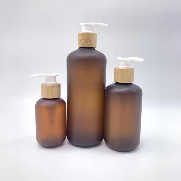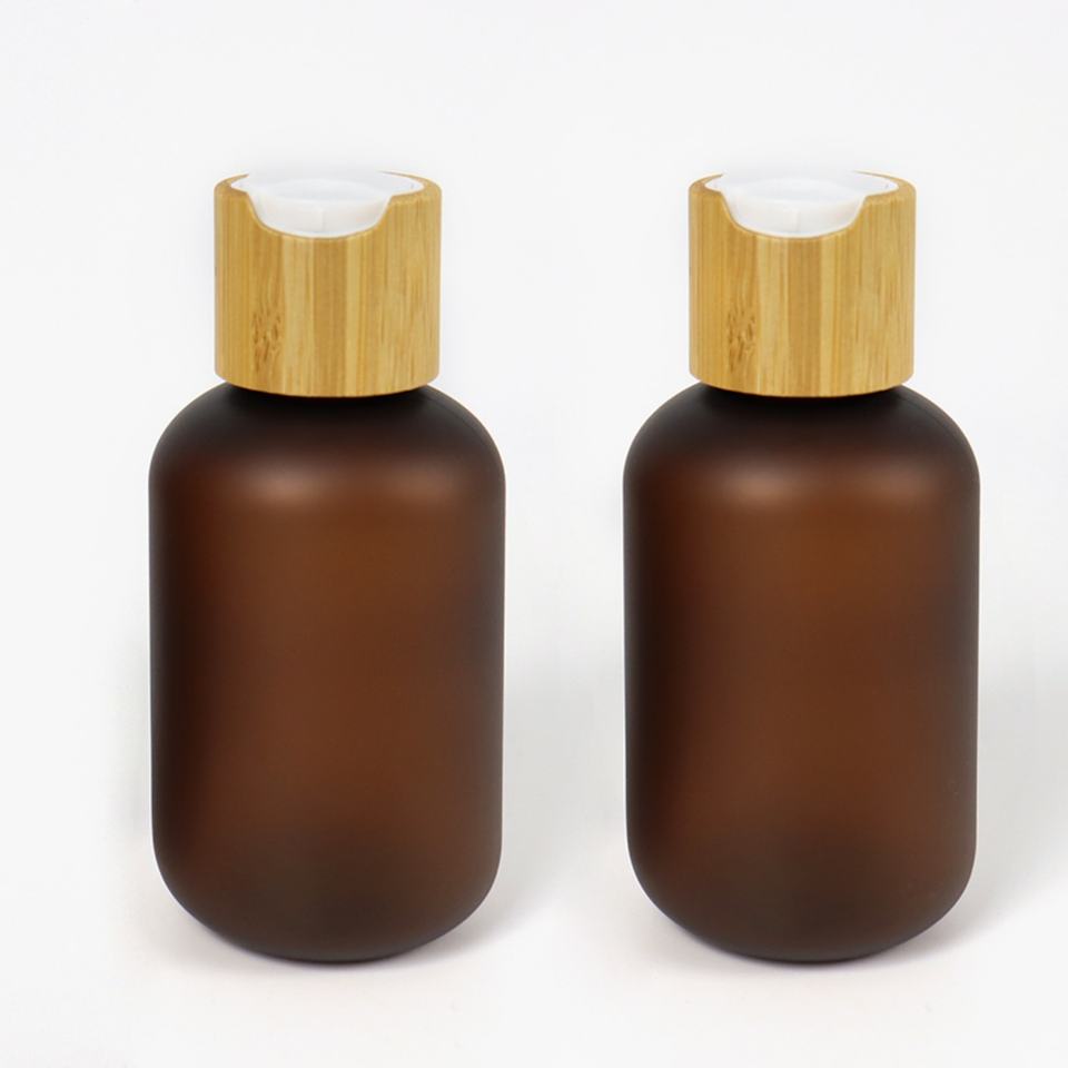ขวดแชมพูและครีมนวดผม PET สีเหลืองอำพันขุ่นพร้อมฝาไม้ไผ่ หัวปั๊มสีดำขาว ขนาด 250 มล./500 มล. บรรจุภัณฑ์โลชั่น (ขั้นต่ำ 100 ชิ้น)