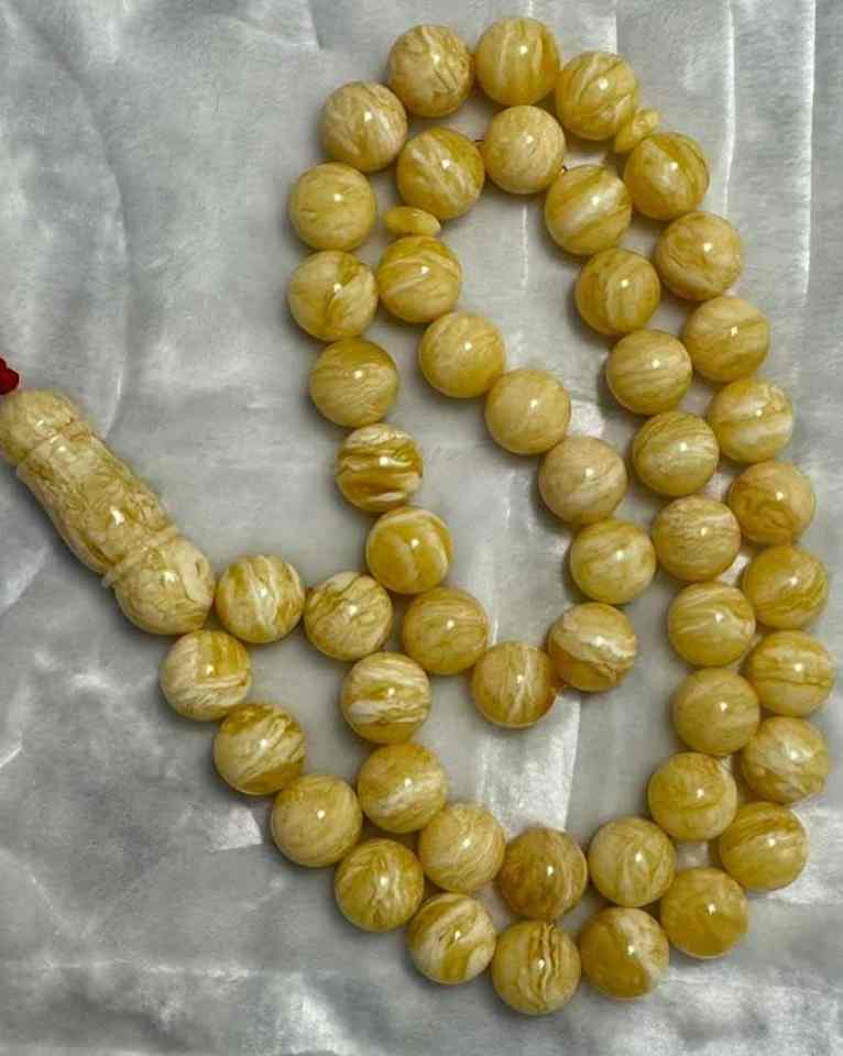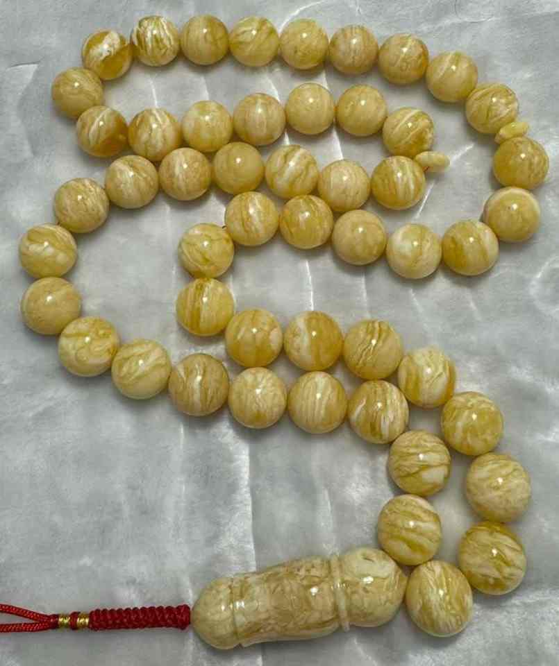 ลูกปัดอำพันธรรมชาติลายเสือสีขาวทรงกลมขนาด 11+ มม. ลูกประคำคุณภาพสูงสำหรับชาวมุสลิม อิหม่าม