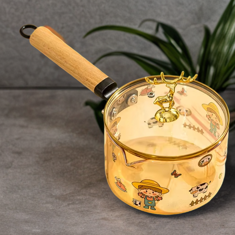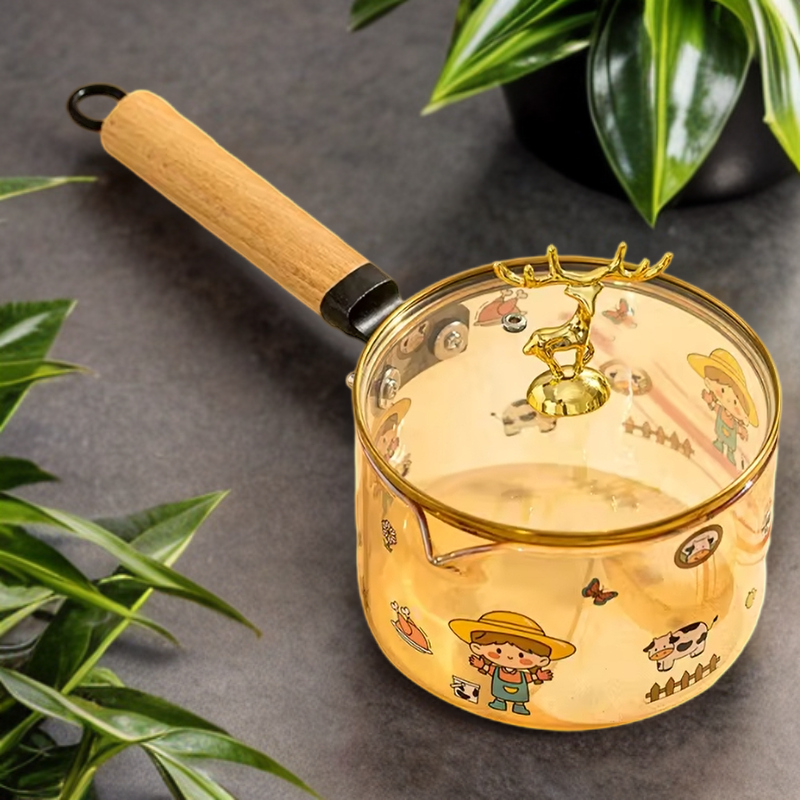 หม้อแก้วกวางพิมพ์สีเหลืองอําพันหม้อก๋วยเตี๋ยวสําเร็จรูปทนความร้อน Borosilicate สูงหม้อเครื่องครัวแก้วพร้อมที่จับไม้