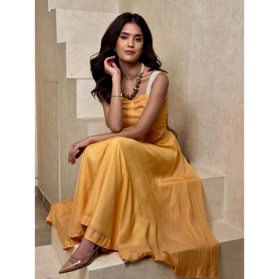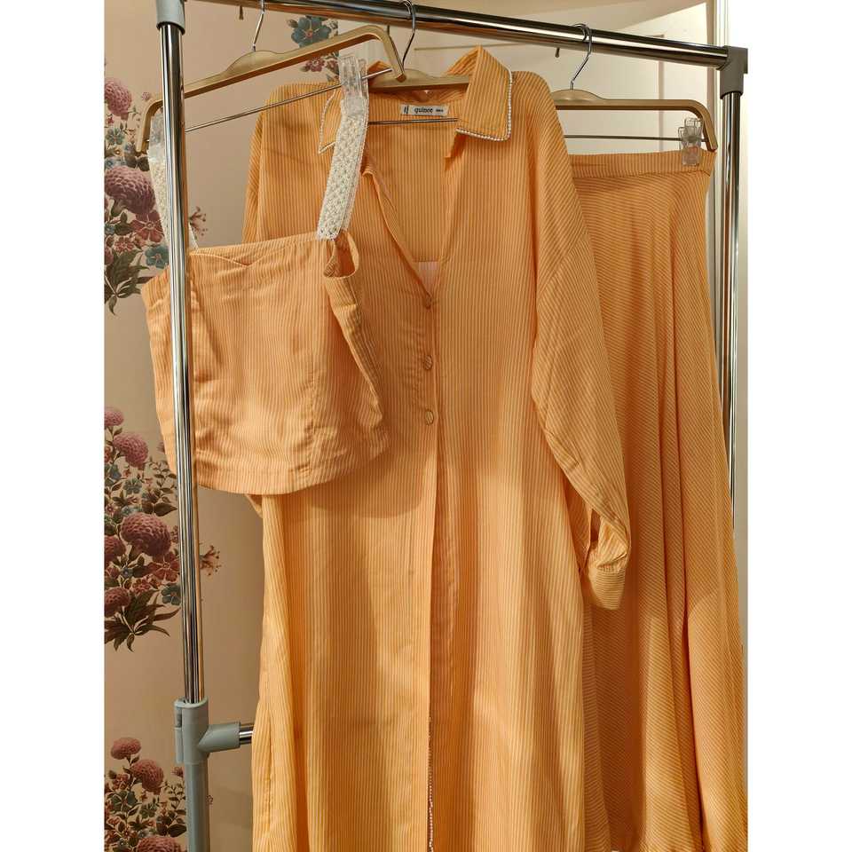 ชุดกระโปรงทรงตรงลายทางสีเหลืองอำพันพร้อมเสื้อเชิ้ตตัวยาว (ชุด 3 ชิ้น) คอตั้ง ใส่ได้ทุกฤดู