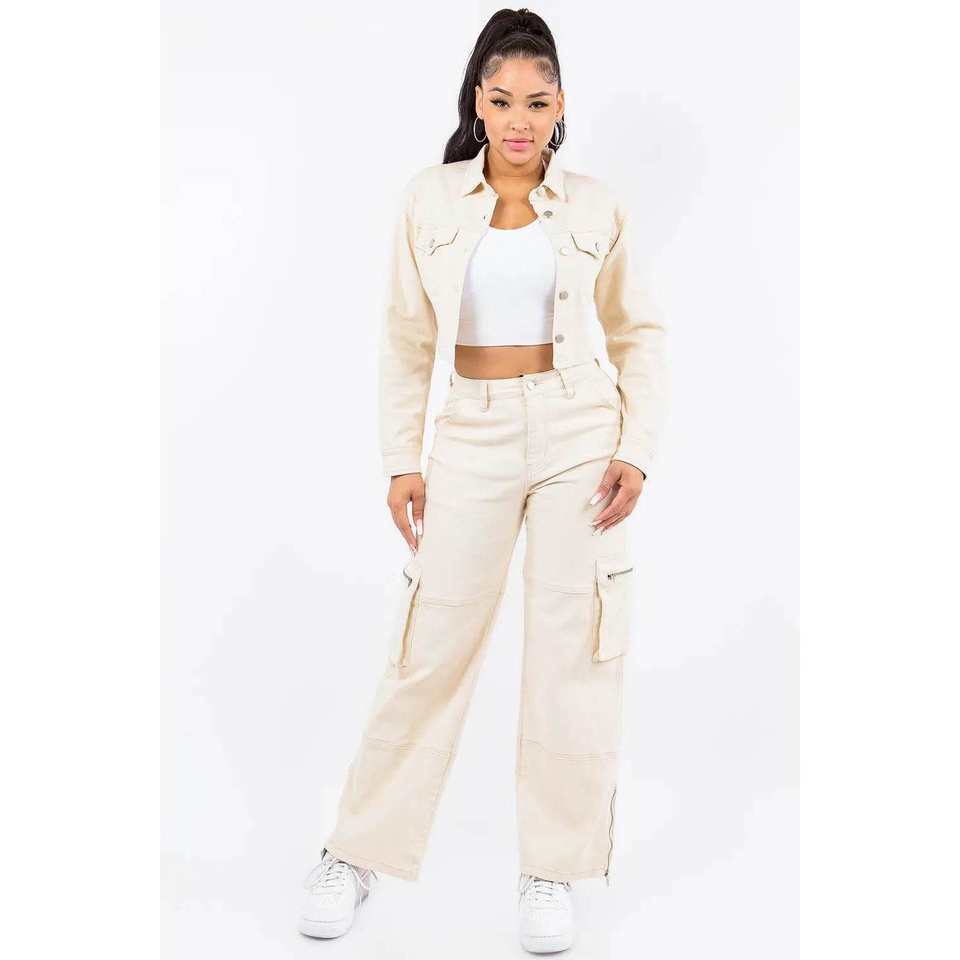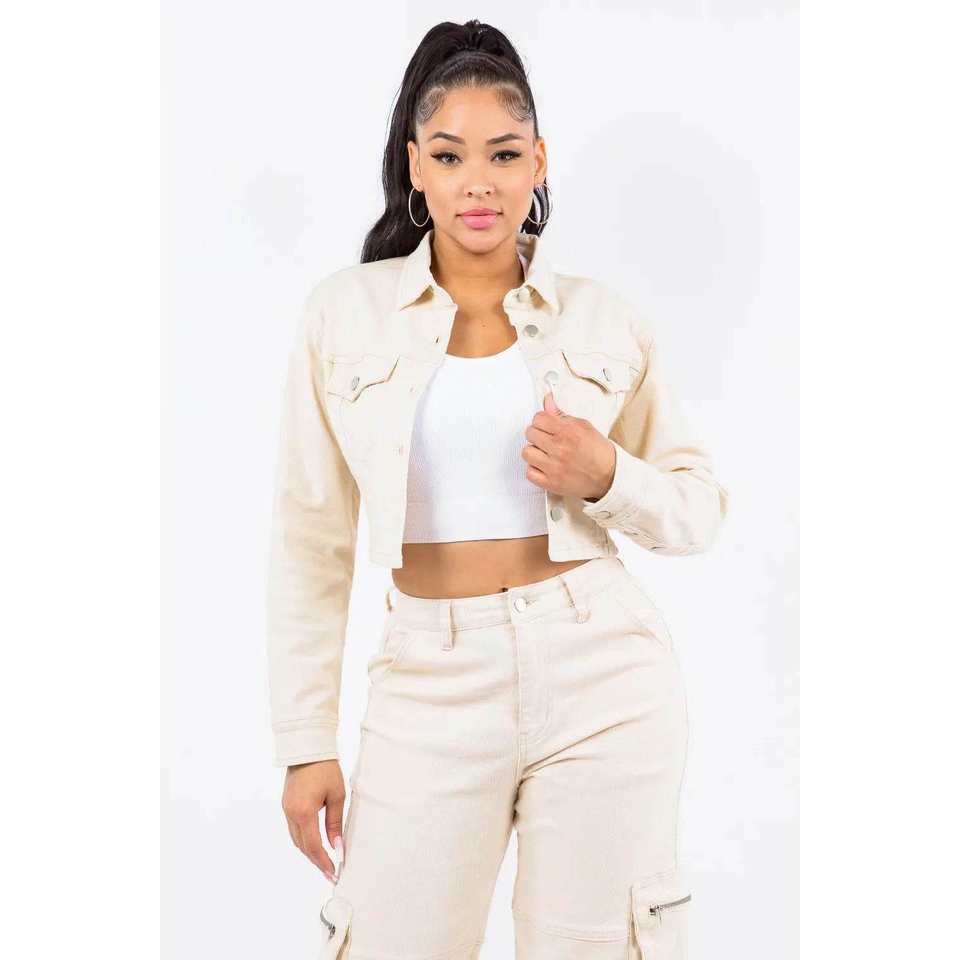 แจ็คเก็ตยีนส์สีงาช้างสำหรับผู้หญิงอเมริกันบาซีพร้อมดีไซน์ครอปด้านหลังแบบผูกเชือก ไซส์ S