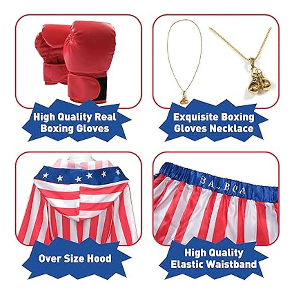 American Flag Boxing Costume for Men and Women Rocky Balboa Costume Adult Satin Boxer Robe with Shorts Belt and Boxing Gloves