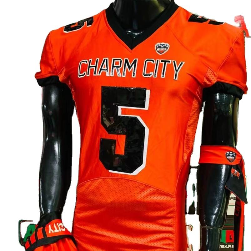 เสื้อฟุตบอลอเมริกันฟุตบอลจริงระบายอากาศได้ดีขนาดใหญ่พิเศษปักลายสิ่งทอลายทแยงกางเกงแบบบูรณาการแพคเกจทีม