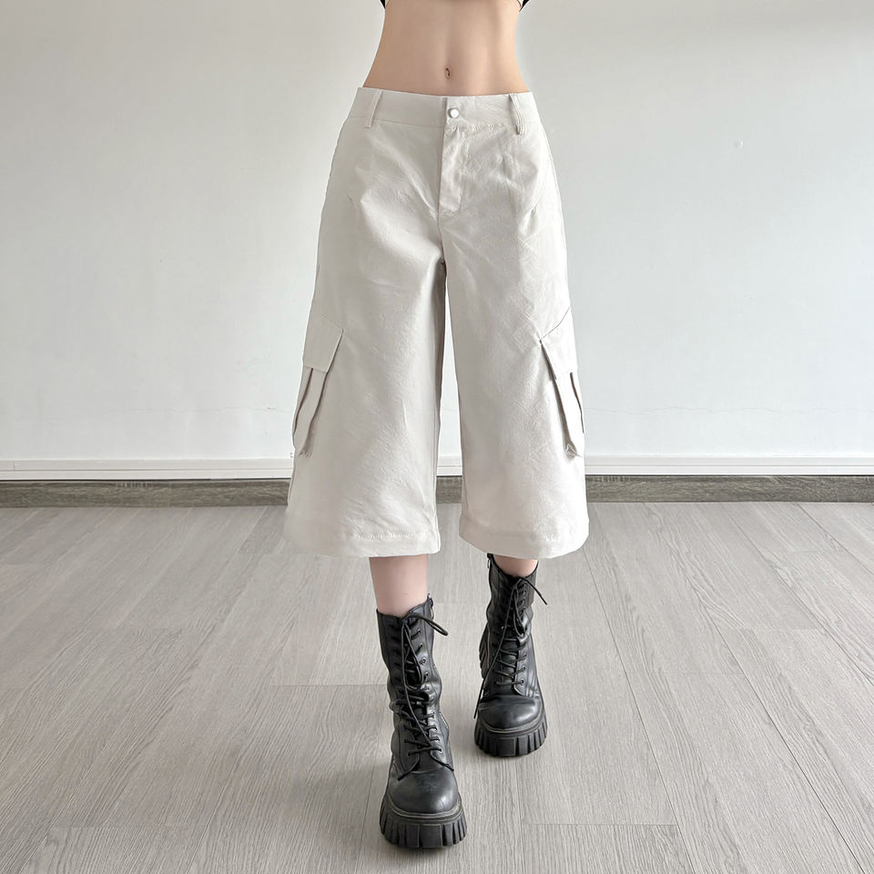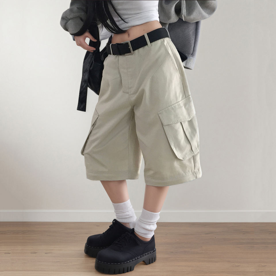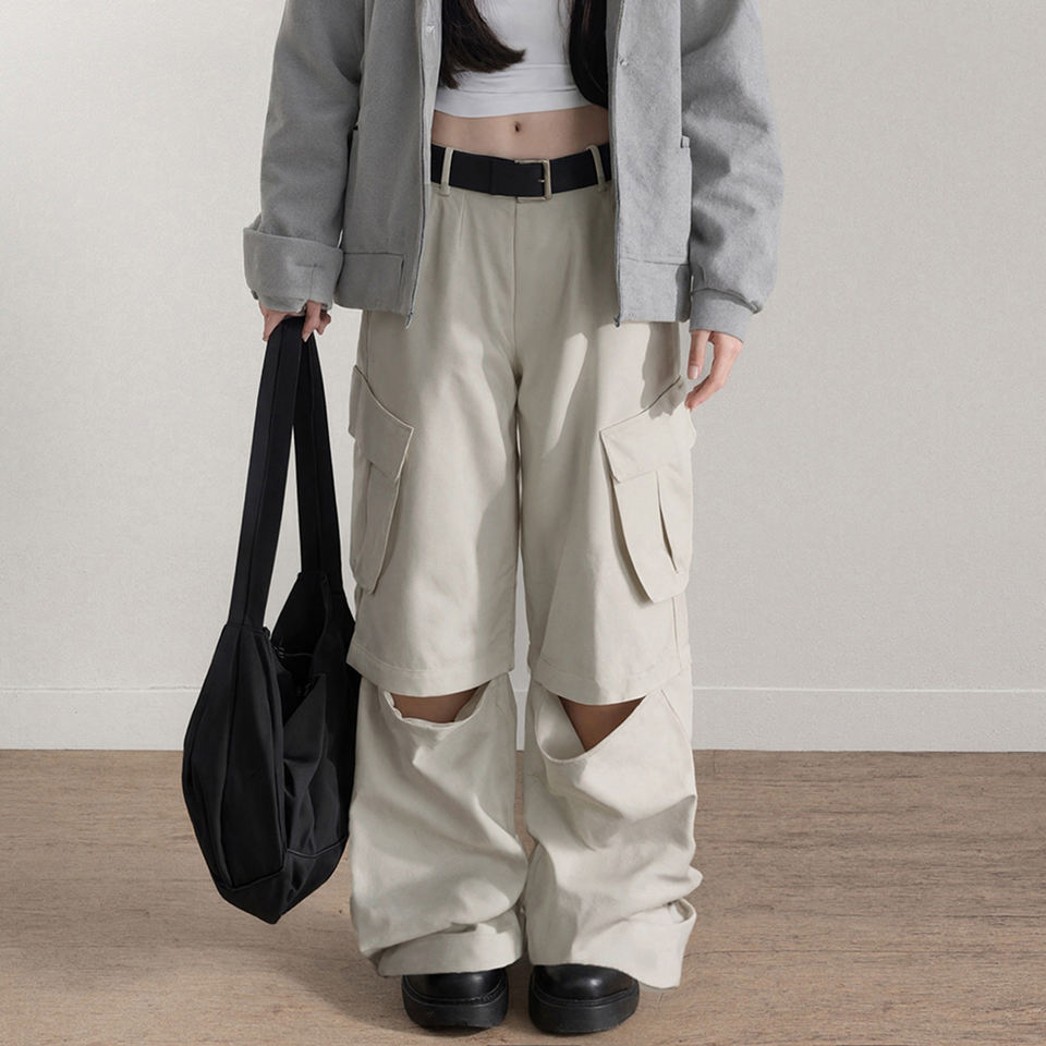 กางเกงคาร์โก้ขาบานสไตล์อเมริกันแบบถอดได้ ใส่ได้สองแบบ สีพื้น ทรงหลวม สบายๆ สำหรับผู้หญิง