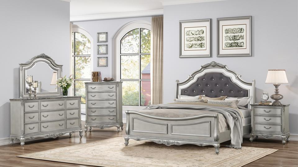 ชุดเฟอร์นิเจอร์ห้องนอนสไตล์อเมริกันสุดหรู ทำจากไม้แกะสลักสีเงิน - เตียงหุ้มเบาะแบบกระดุม ตู้เสื้อผ้า โต๊ะข้างเตียง และตู้เก็บของ พร้อมของตกแต่งบ้านสุดอลังการ