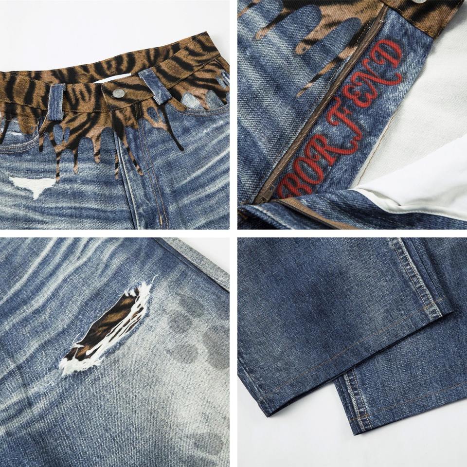 กางเกงขายาวผู้ชายสไตล์อเมริกัน ลายพรางเสือ แต่งลายขาดๆ ปะติดปะต่อ ลายกรงเล็บเสือ ทรงหลวม แบรนด์แฟชั่น