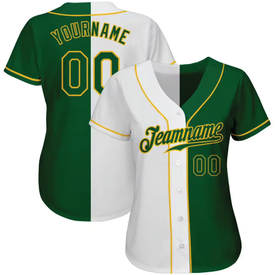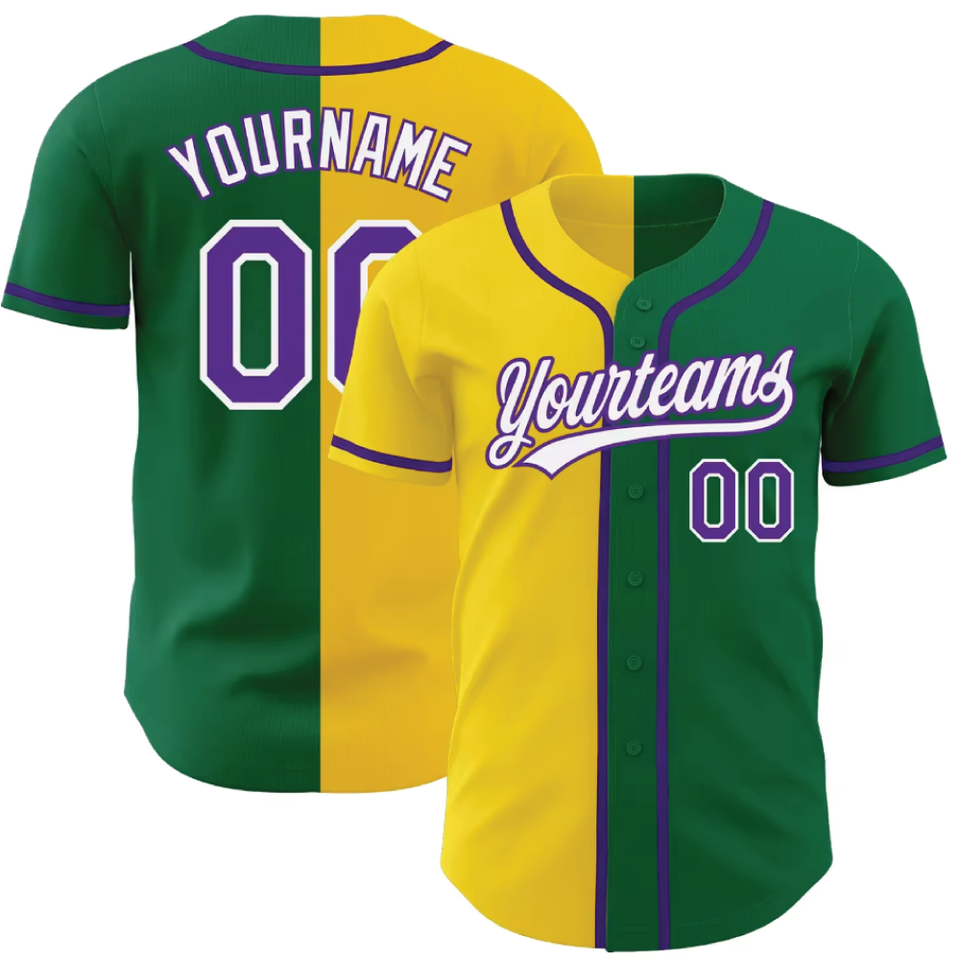 เสื้อเบสบอลเยาวชนแบบปักลายสไตล์อเมริกัน สีเหลืองและเขียว ลายบล็อกสีทั้งตัว แบบซับลิเมชั่น สั่งทำได้
