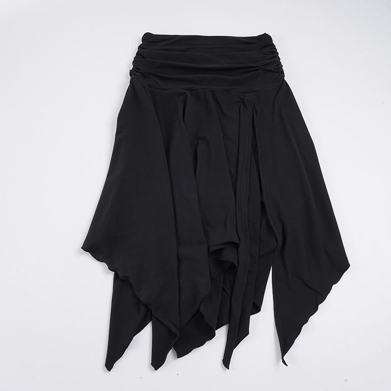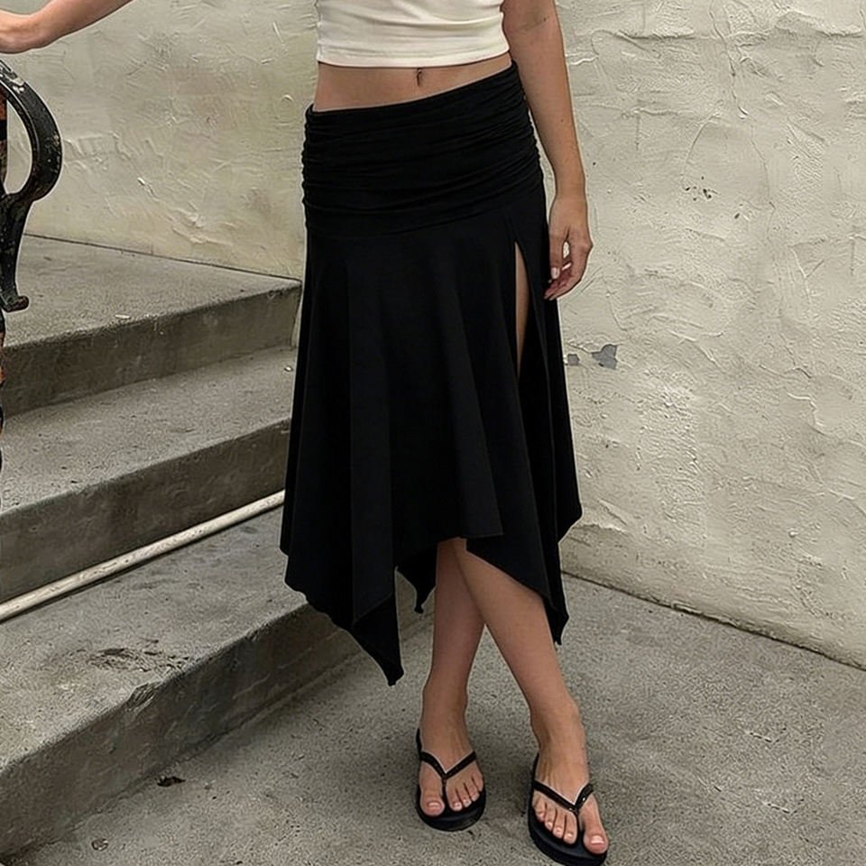 แฟชั่นสไตล์อเมริกัน กระโปรงมิดิสีพื้น ขอบเอวพับได้ ผ่าข้างแบบอสมมาตร ดีไซน์หรูหรา ใส่ได้หลากหลาย ทรงหลวมสบาย