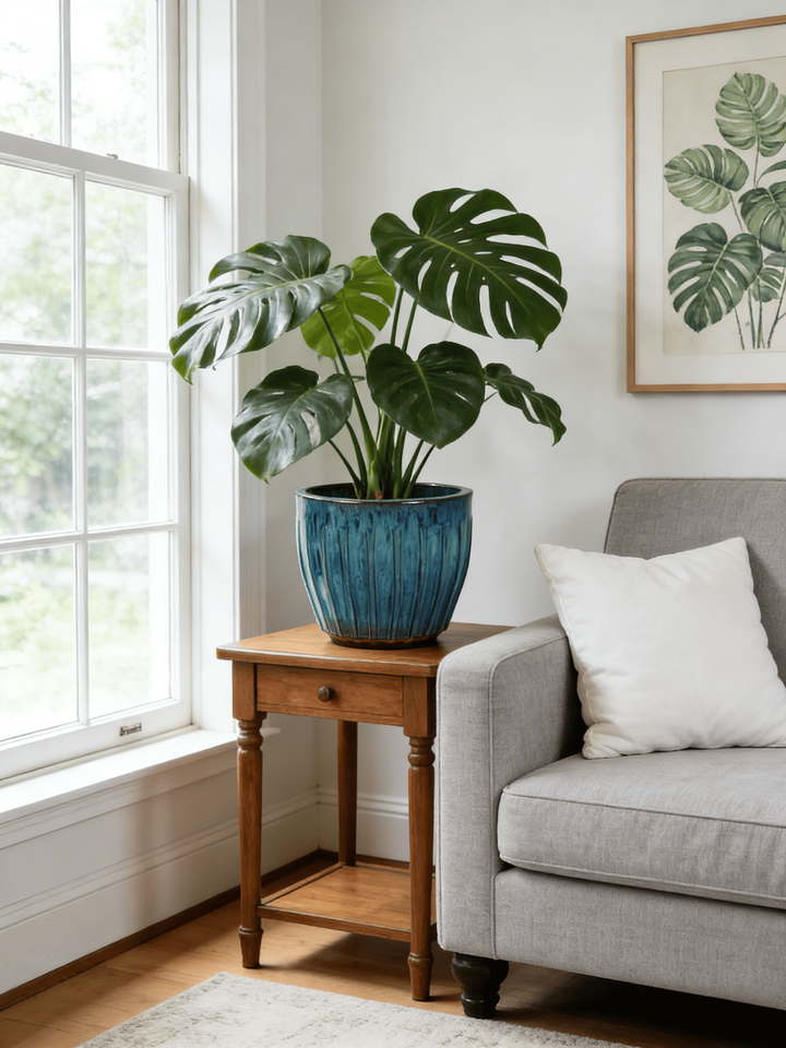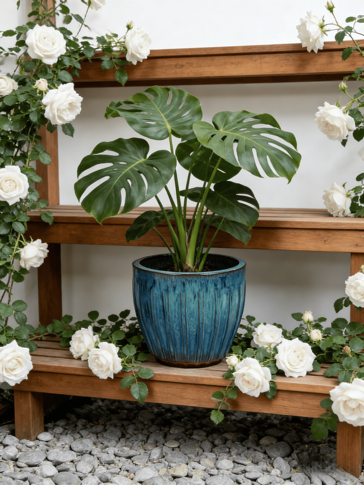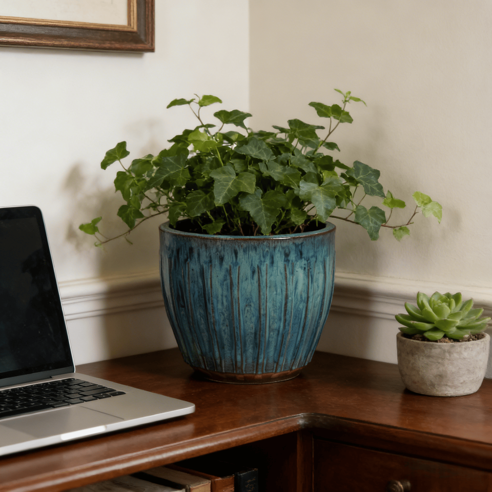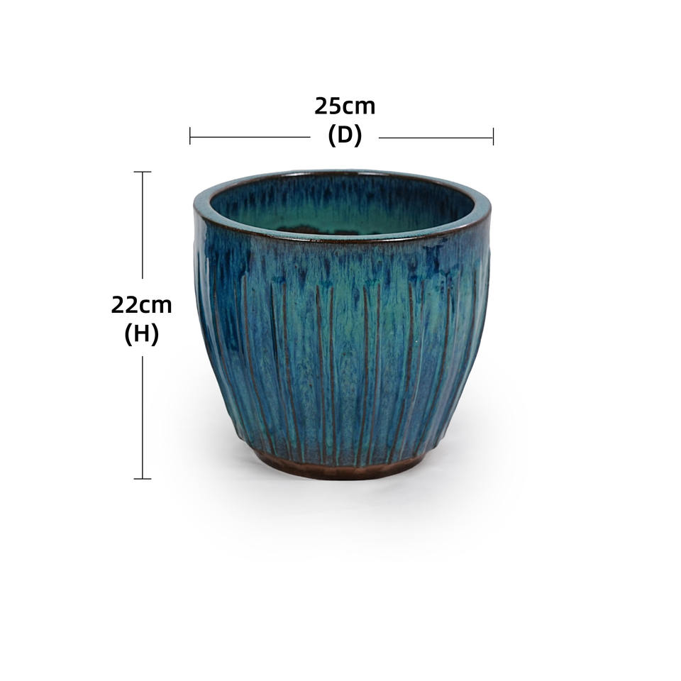 กระถางต้นไม้เซรามิกเคลือบสีฟ้าเทอร์ควอยซ์ไล่เฉดแบบอเมริกันวินเทจ ลายริ้ว รักษาสิ่งแวดล้อม ทนทาน ระบายน้ำได้ดี เหมาะสำหรับตกแต่งบ้าน