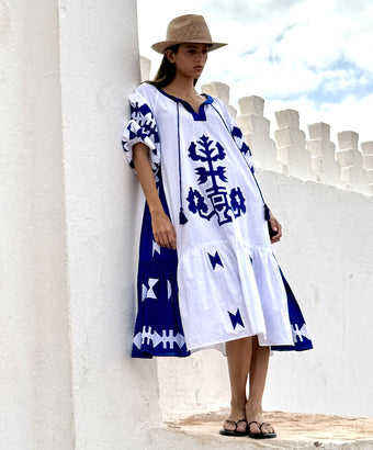 Amersham ชุดเดรสมิดิใส่สบายผ้าคอตตอนเนื้อนุ่มผ้าคอตตอนพิมพ์ลายต้นไม้สีน้ำเงินเข้มย้อมสีธรรมดาเป็นมิตรกับสิ่งแวดล้อม