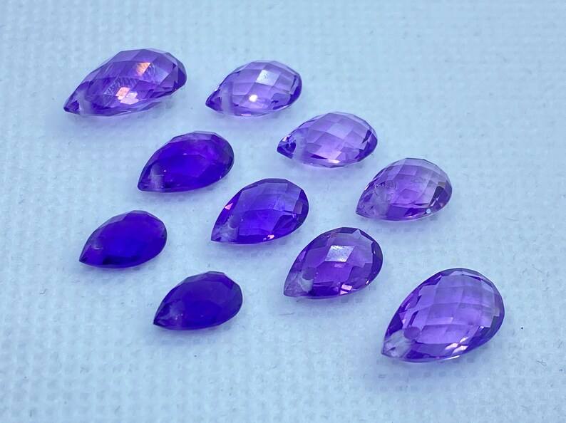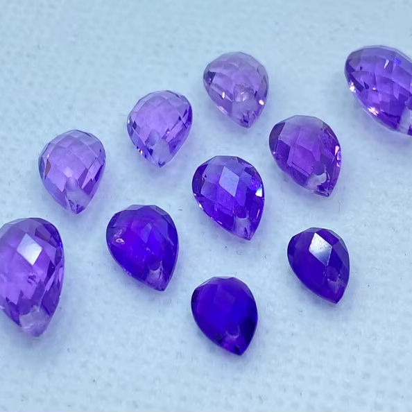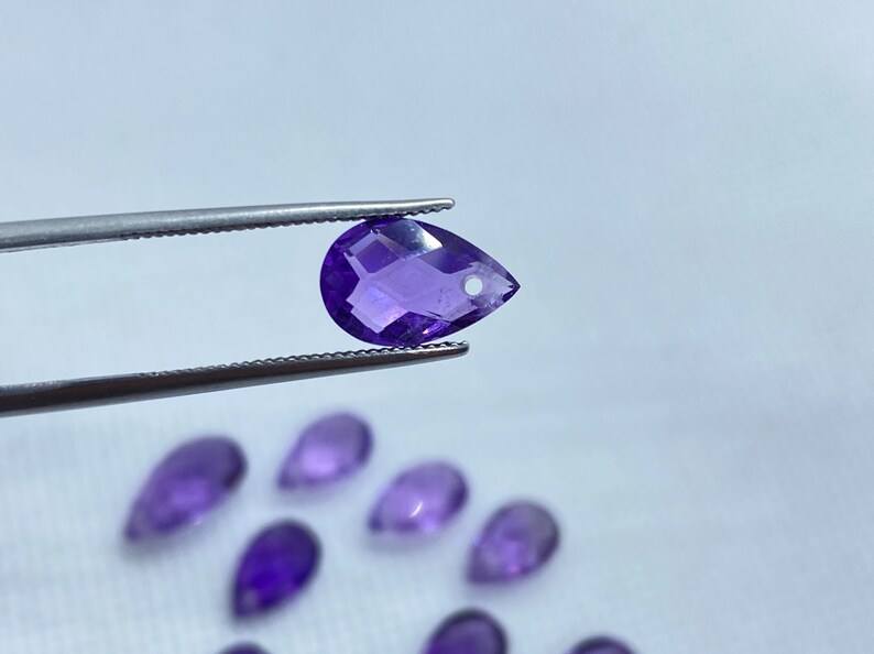 อเมทิสต์ทรงลูกแพร์เหลี่ยมเพชรพลอยสองด้านเจียระไนแบบตารางหมากรุก มีรูขนาด 1 มม. ขนาดต่างๆ ตั้งแต่ 8x6 มม. ถึง 16x11 มม. สำหรับทำเครื่องประดับ
