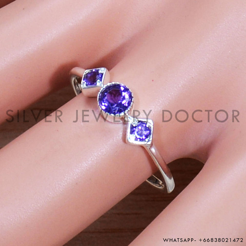 แหวนพลอยสีม่วงทรงกลมสีเงิน925แหวนแฟชั่นสำหรับสตรี
