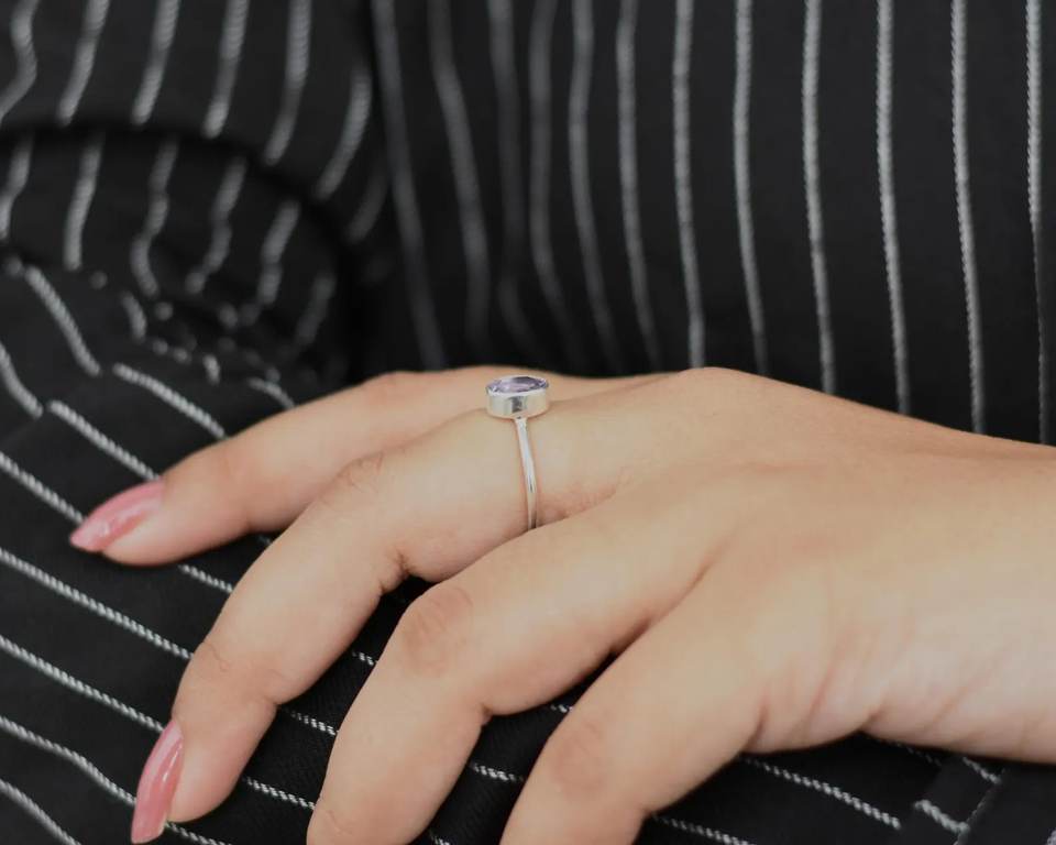 แหวนอเมทิสต์925เงินสเตอร์ลิงขอบรูปไข่6x8มม. ทำด้วยมือเครื่องประดับอัญมณีสีม่วงของขวัญแหวนสำหรับผู้หญิงที่สวยงาม