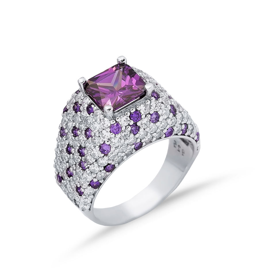หินอเมทิสต์ทรงสี่เหลี่ยมเพชรพลอย CZ 925เงินสเตอร์ลิงทำด้วยมือเครื่องประดับแหวนคลัสเตอร์หิน