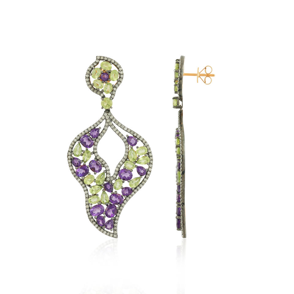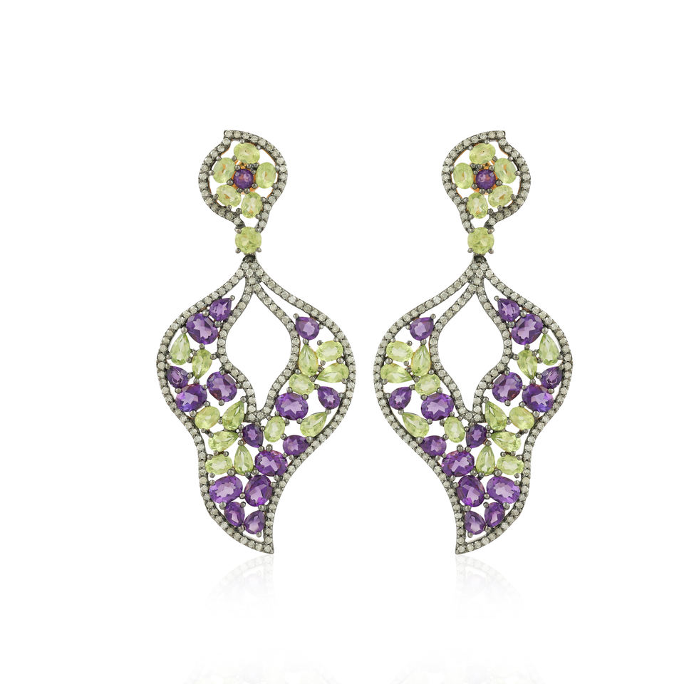 ต่างหูห้อยประดับลายเพสลีย์แบบฉลุลาย ประดับด้วยอเมทิสต์และเพอริดอต ต่างหูห้อยประดับเพชรแบบปาเว่ ตกแต่งอย่างหรูหรา โดดเด่นด้วยอเมทิสต์รูปไข่แบบผสมผสาน
