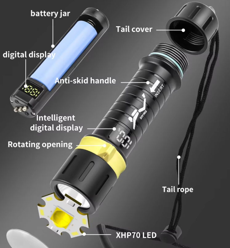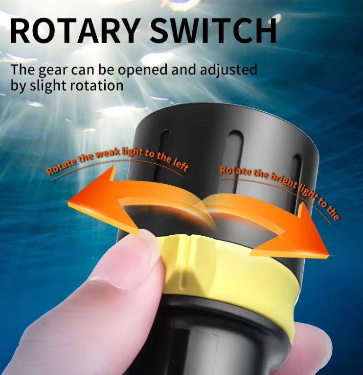 ไฟ LED ดำน้ำแบบสะเทินน้ำสะเทินบก สวิตช์ควบคุมด้วยแม่เหล็ก สำหรับสำรวจถ้ำใต้น้ำลึก ไฟฉายดำน้ำสำหรับตกปลา