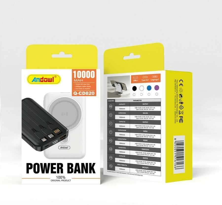 AnDowl พาวเวอร์แบงค์ 10000 มิลลิแอมป์ชั่วโมง 18 วัตต์ ชาร์จเร็ว ชาร์จไร้สาย ช่องเสียบ USB Type C อเนกประสงค์ แบตเตอรี่ลิเธียมโพลิเมอร์พลาสติก