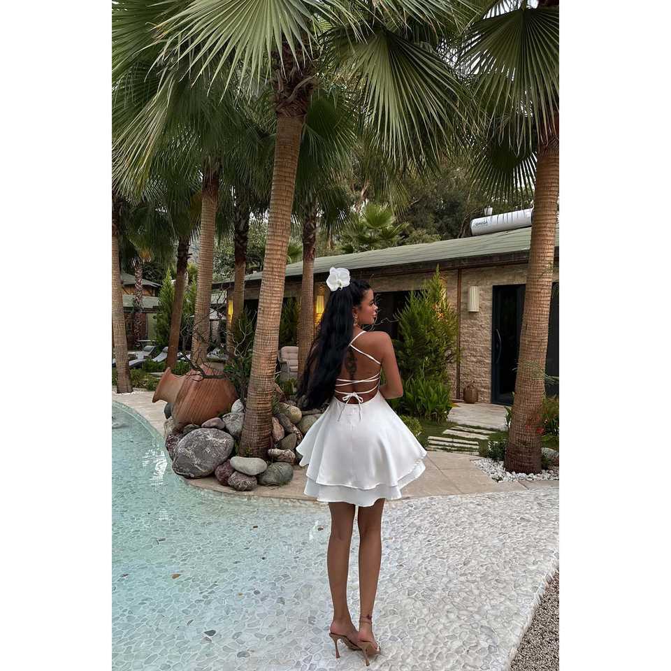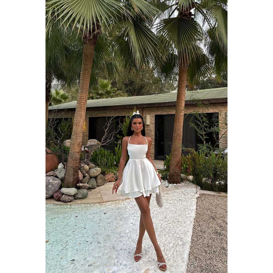 ชุดเดรสผ้าซาตินสีขาว Anabel สำหรับงานเลี้ยงอย่างเป็นทางการ ไซส์ XL รับทำโลโก้ ผ้าวิสโคสคุณภาพสูง คอแบบผูกหลัง คอเหลี่ยม ยาวกรอมพื้น ODM สำหรับใส่ไปเที่ยวคลับ