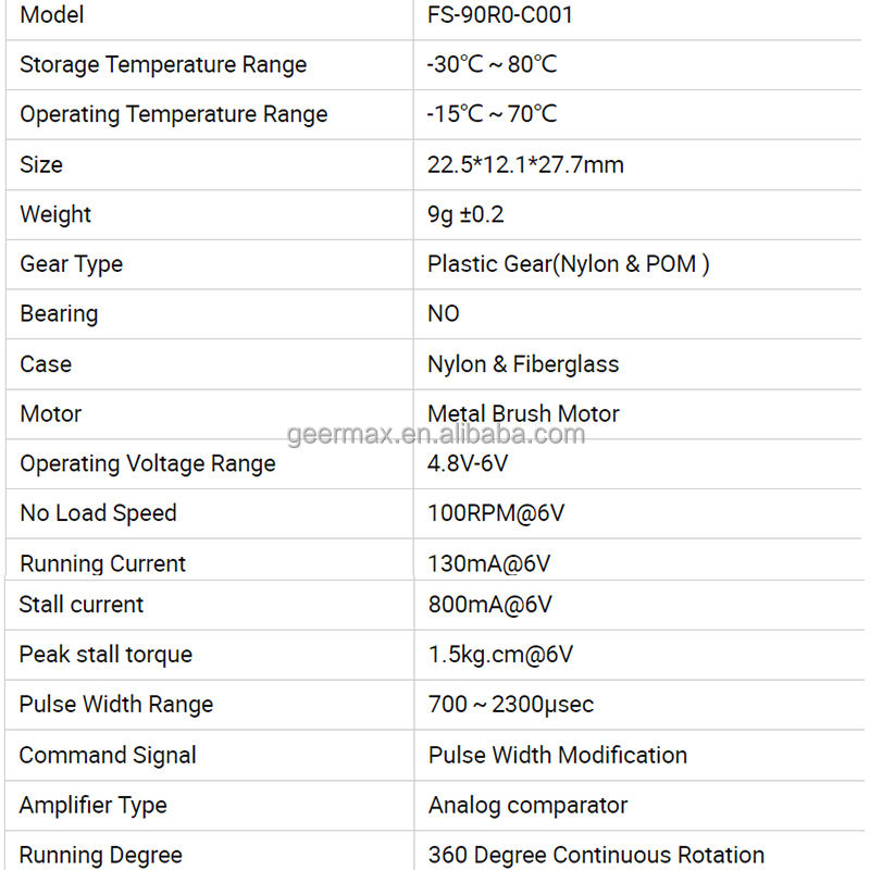 หมายเลขรุ่น: อนาล็อก 360 ° เซอร์โวต่อเนื่อง FS90R 4.8V 1.3Kg