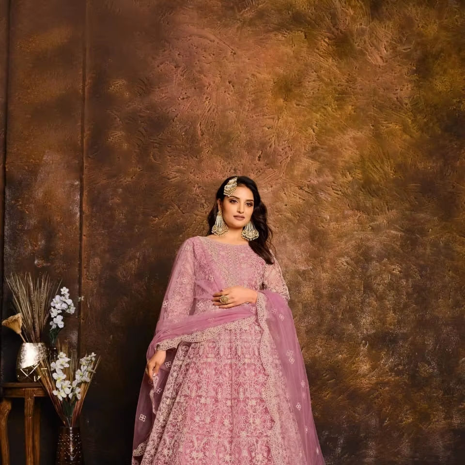 ชุดเดรสอานาร์กาลีผ้าเน็ตปักลายแบบอินเดีย ดีไซน์เนอร์ชาวอินเดีย ผ้าเน็ตหนาปักลายทั้งด้านบนและด้านล่าง พร้อมผ้าคลุมไหล่