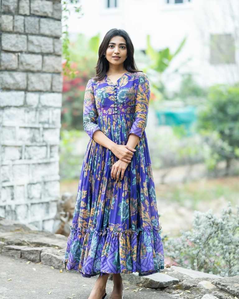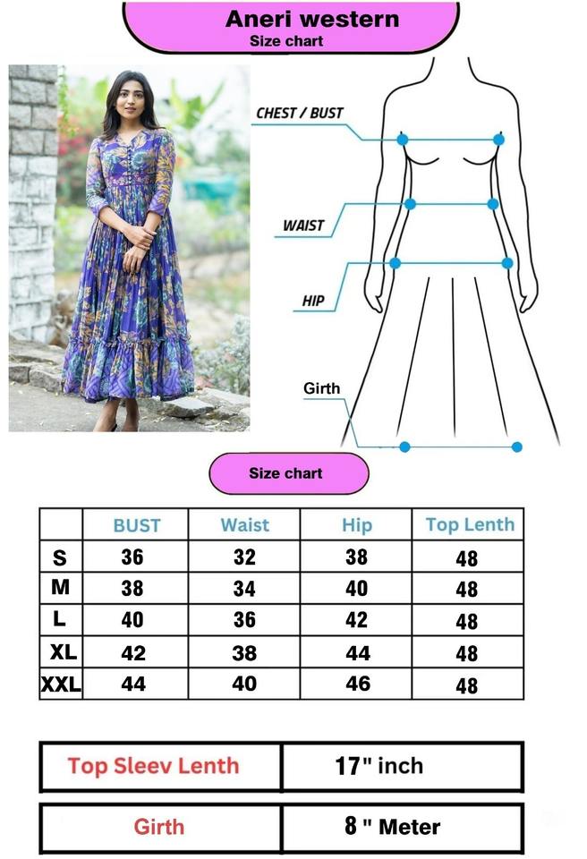 เดรสยาวปานกลางทรงปล่อยชายผ้าจอร์เจตต์สไตล์อานาร์กาลี ลายดอกไม้สไตล์อินเดีย คอวี ผ้าไม่ยับ ติดกระดุม สำหรับผู้หญิง