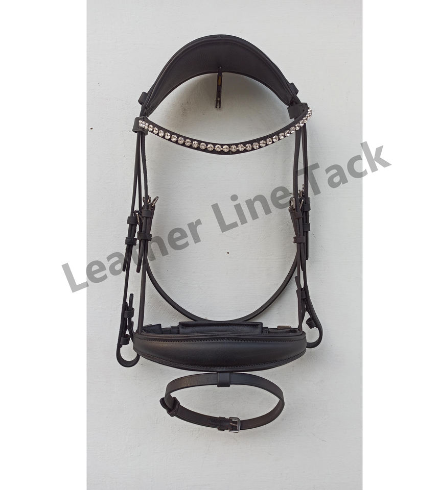 บังเหียนม้าหนังแท้สีดำแบบ Anatomic ย้อมสีด้วยมือ งานแฮนด์เมดสไตล์อังกฤษ ประดับคริสตัลใส สายคาดหน้าผากแบบบาง พร้อมแผ่นรองศีรษะ