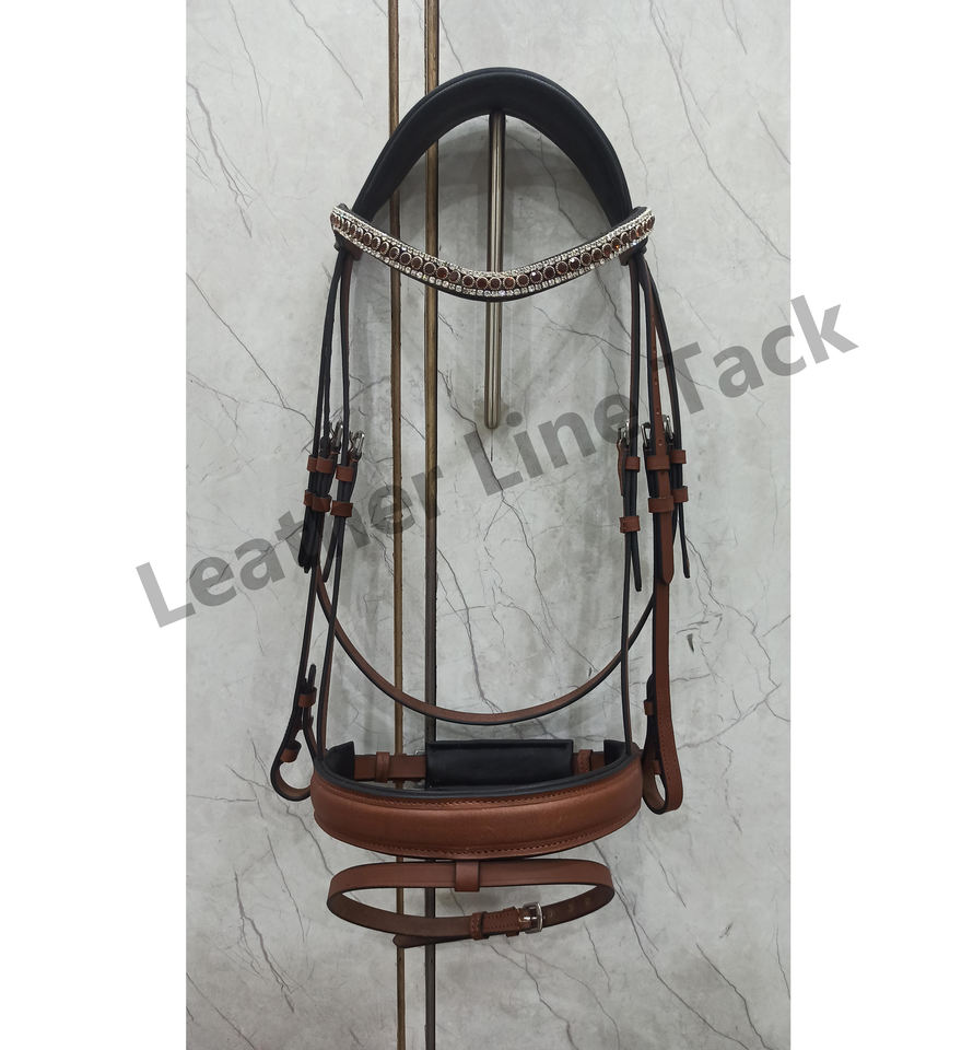 โทแพซทำจากหนังวัวสีน้ำตาลเข้มมี3แถวทำจากหนังม้าบังเหียนแบบอังกฤษสายคาดคิ้วคริสตัลสีดำ