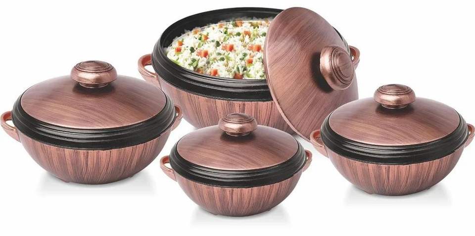 หม้อตุ๋นพลาสติกหุ้มฉนวน Anax Impex ความจุ 3 ลิตร รูปทรงกลม พร้อมฝาปิด ชุด 4 ใบ คุณภาพพรีเมียมสำหรับใช้ในบ้าน ผลิตในอินเดีย ปลอดสาร BPA สามารถวางซ้อนกันได้