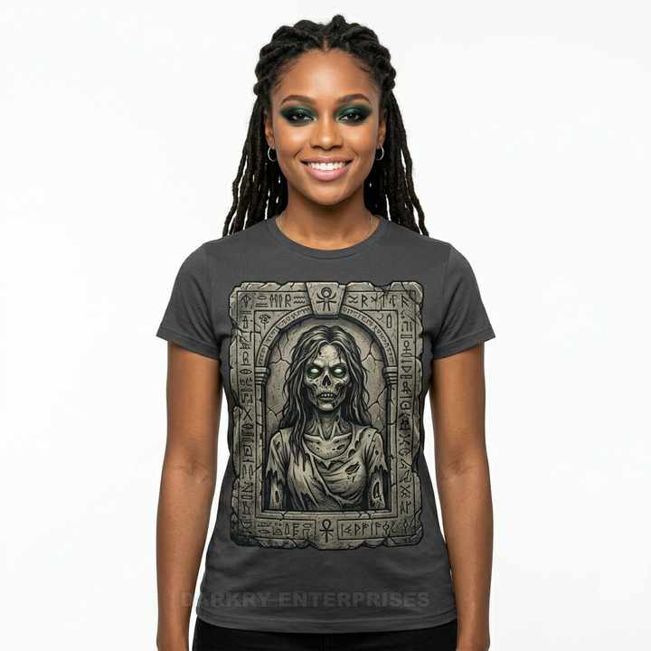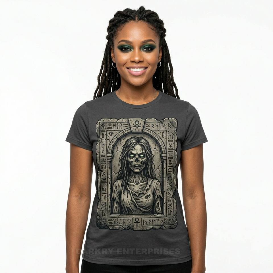 เสื้อยืดลายกระดูกโครงกระดูกจากแผ่นหินอียิปต์โบราณ พิมพ์ลายอักษรโบราณแบบกำหนดเอง เสื้อยืดผู้หญิงขายส่ง ธีมประวัติศาสตร์ เสื้อผ้าลายกราฟิก
