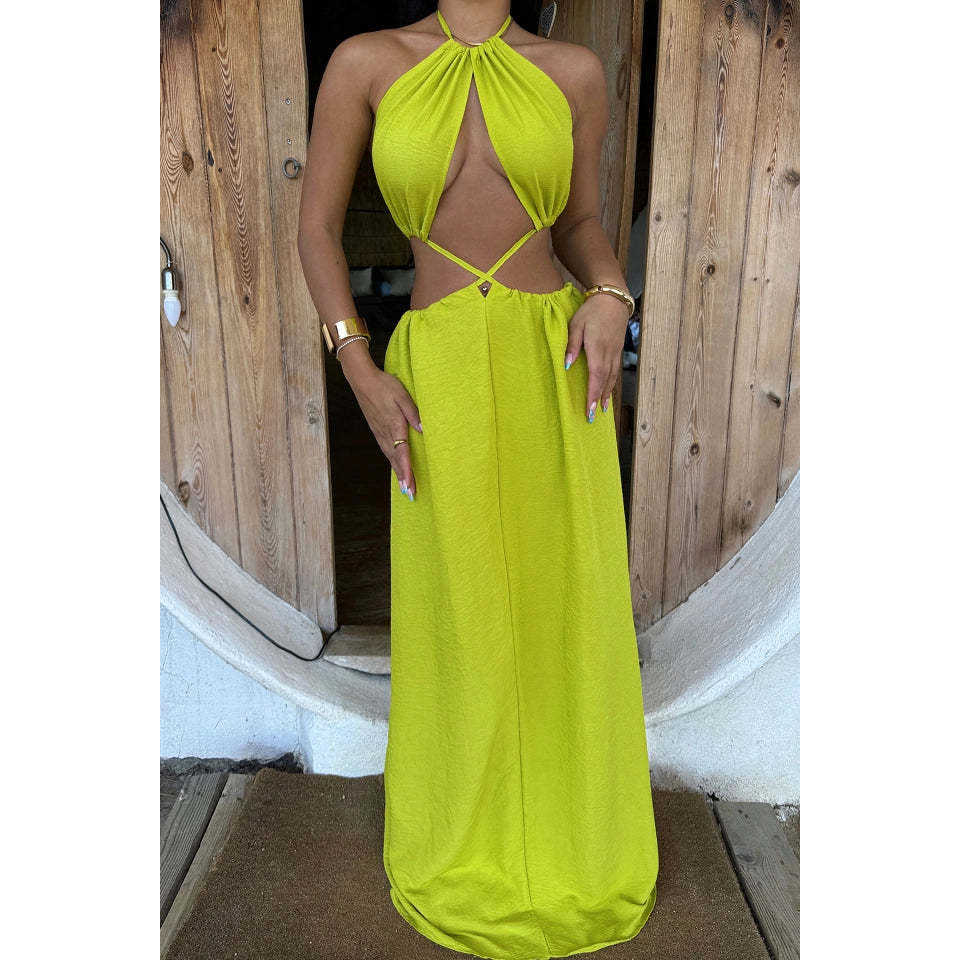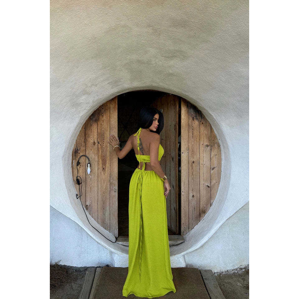 ชุดราตรีสีเขียวแบบยาว คอต่ำ ทรงบอลกาวน์ เอวสูง ไซส์ XL สำหรับงานเลี้ยงตอนเย็น