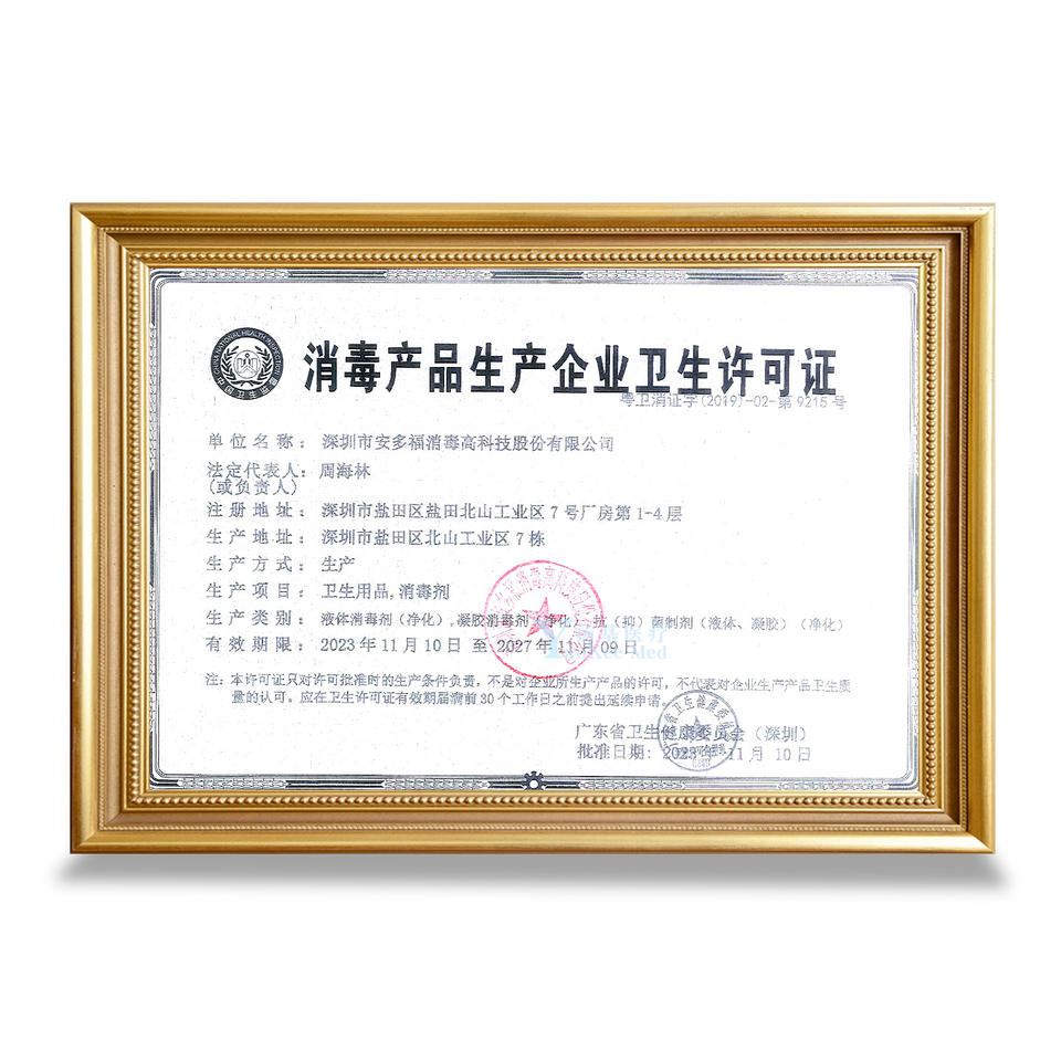 Guangdong Health Disinfection Certificate No. 2019-02-9215Health License Number