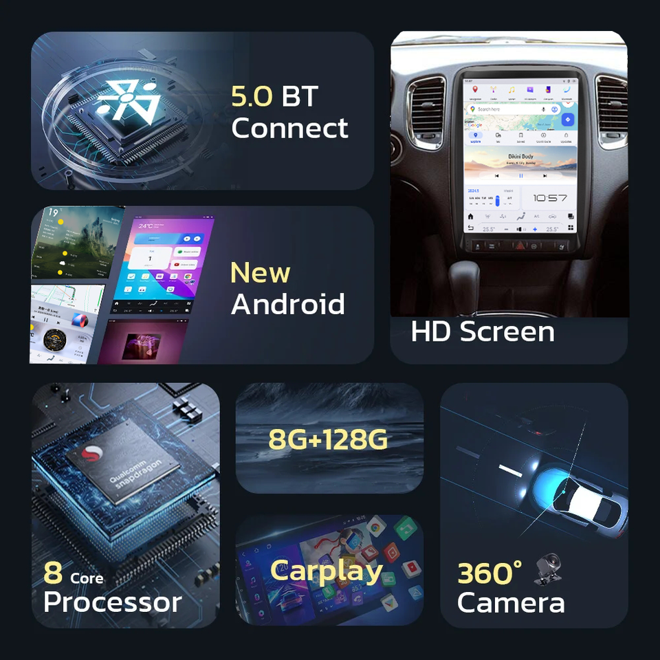 GPS, สเตอริโอ, แฮนด์ฟรี, เครื่องขยายเสียง, OBD2, DSP, คาร์เพลย์, Android Auto, หน้าจอแยก, ควบคุมพวงมาลัยรถยนต์