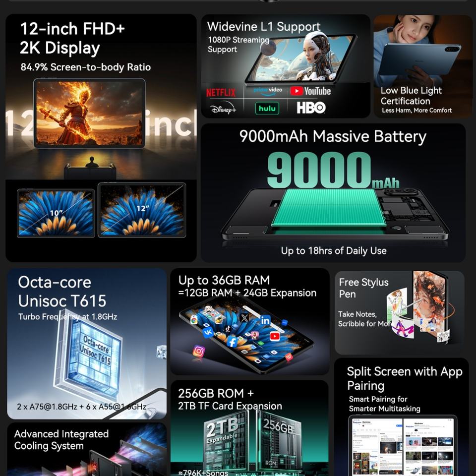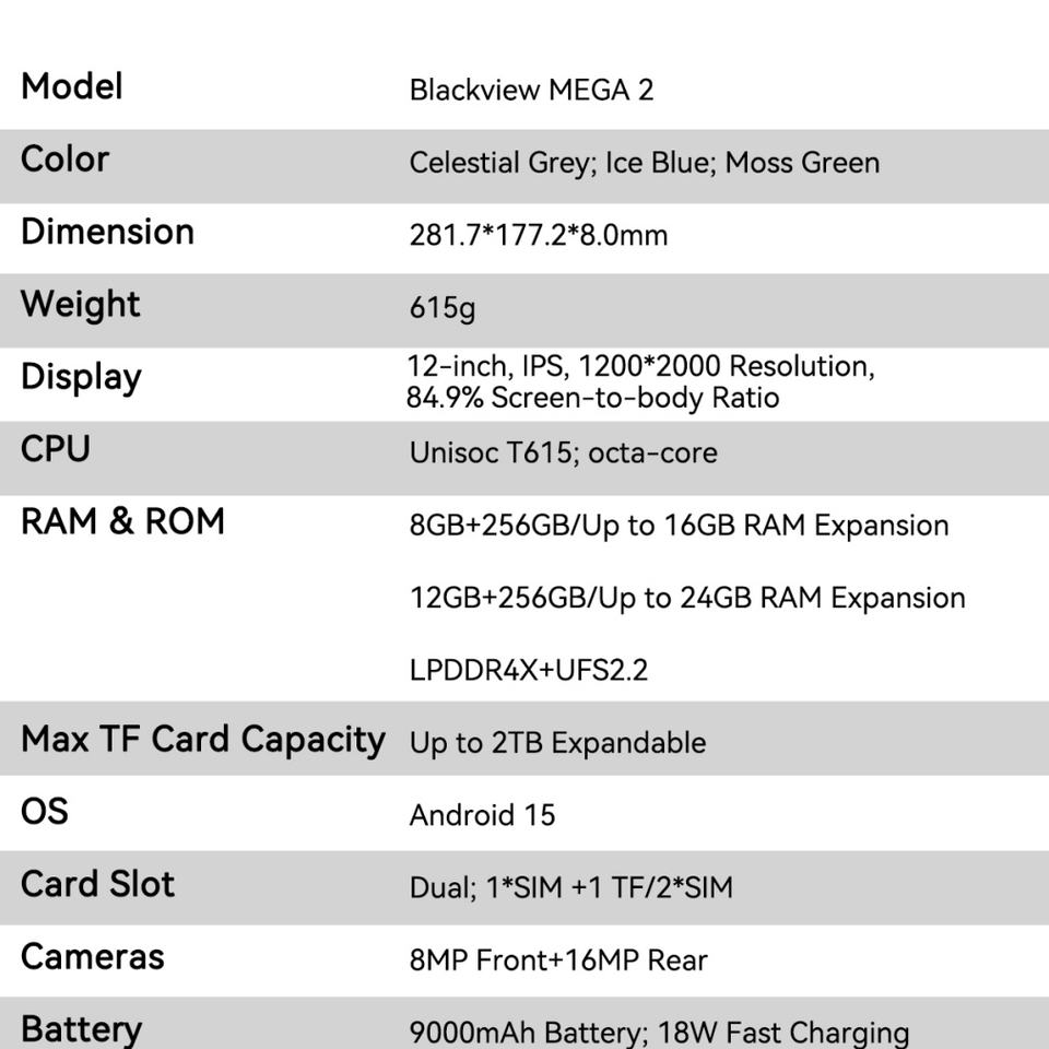 แท็บเล็ตพีซี Android 15 ขนาด 12 นิ้ว หน้าจอ 1200*2000 ชิปประมวลผล T616 รุ่นล่าสุด แบตเตอรี่ 9000mAh หน่วยความจำ 12+256GB กล้อง 8+16MP Blackview TAB Blackview Mega 2