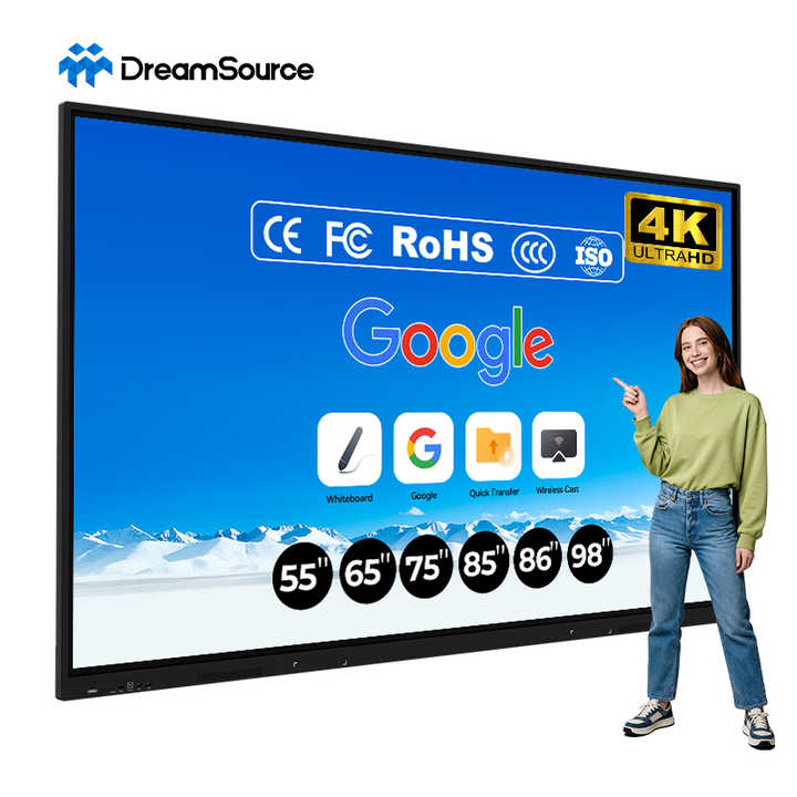 จอแสดงผลอินเทอร์แอคทีฟระบบแอนดรอยด์ วินโดวส์ ขนาด 65 นิ้ว ความละเอียด 4K สมาร์ทไวท์บอร์ดสำหรับการสอนและการประชุม รองรับมัลติทัช พร้อมกล้อง