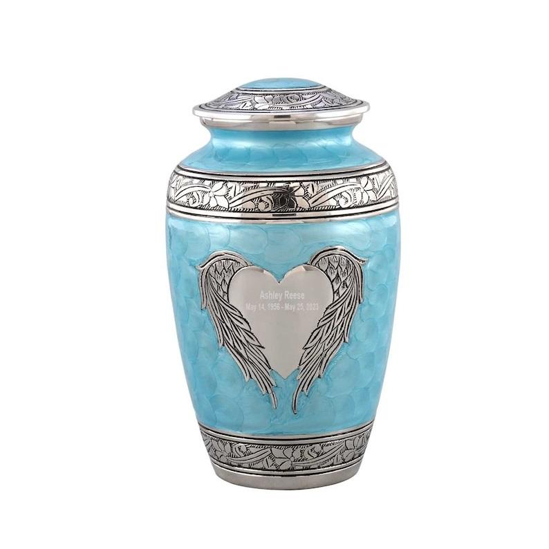 โกศปีกนางฟ้าสีน้ำเงินใบใหญ่สำหรับใส่เถ้ากระดูกของมนุษย์ขี้เถ้าสีน้ำเงินหัวใจสำหรับผู้ใหญ่