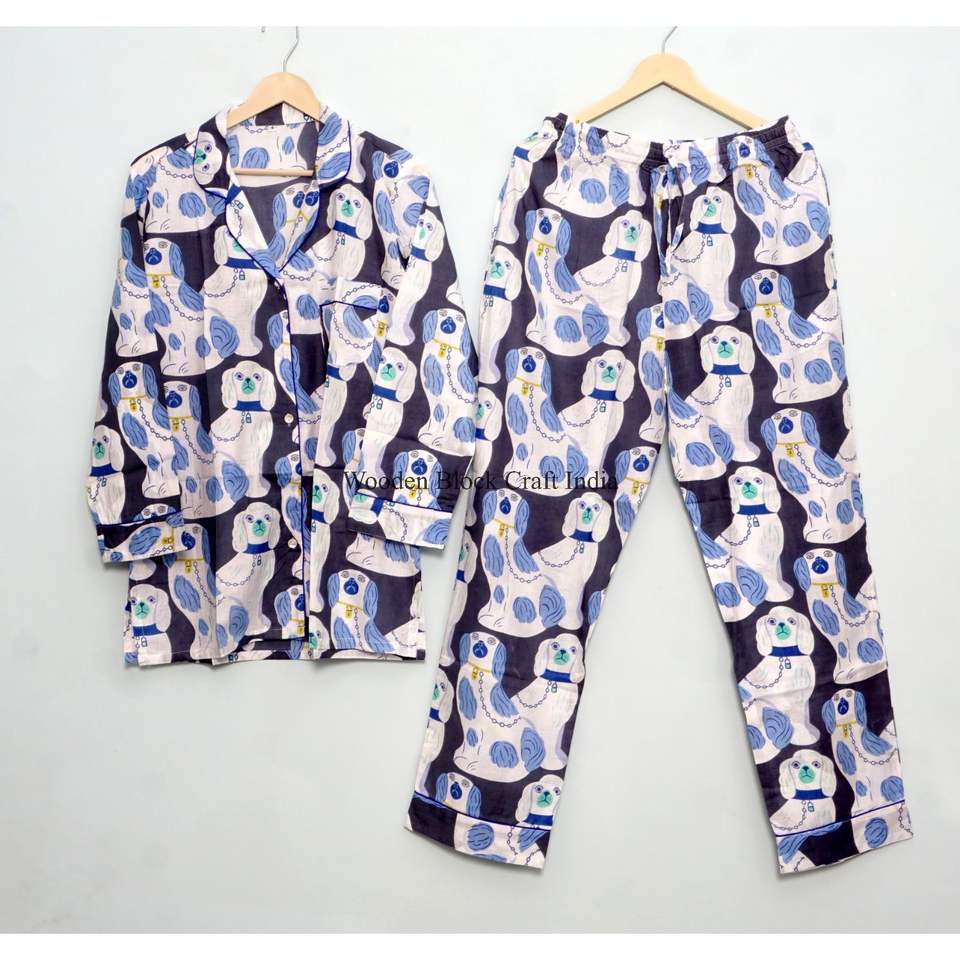 ชุดนอนผ้าฝ้ายลายสัตว์ ชุดนอนลายบล็อกโบฮีเมียนสำหรับผู้หญิง ชุดนอนฤดูร้อน ชุดนอนสองชิ้น