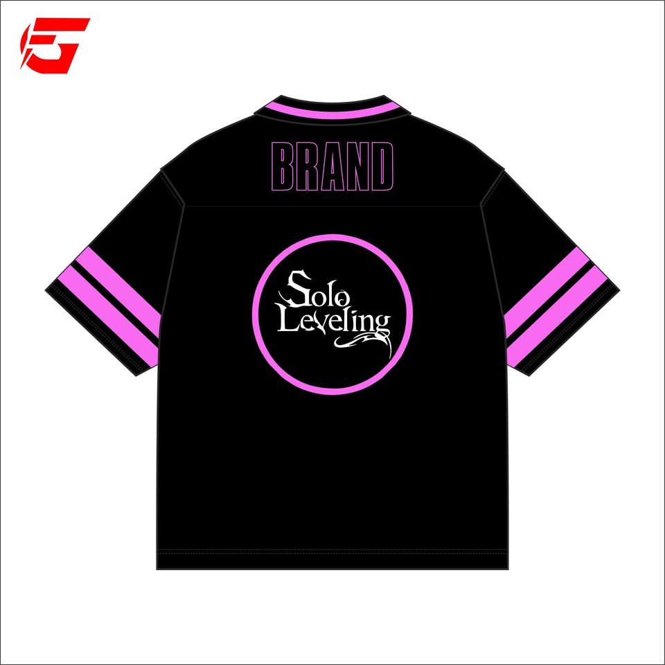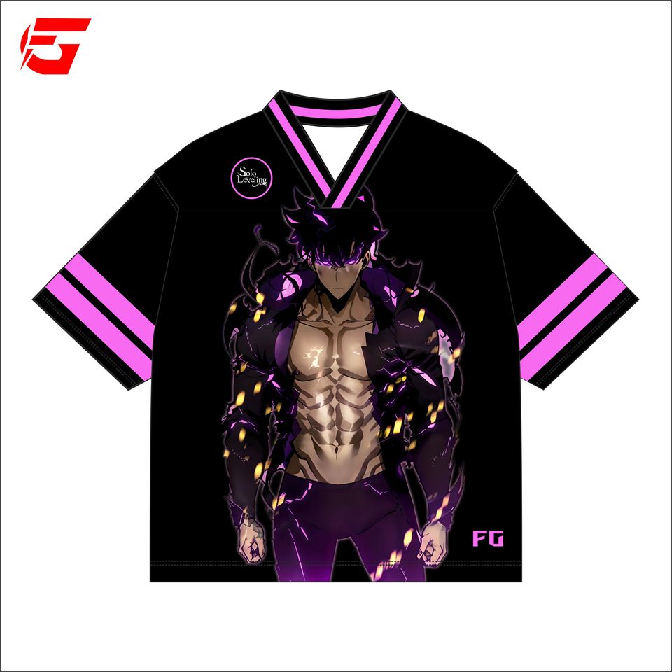 เสื้อเจอร์ซีย์อนิเมะโซโลเลเวลลิ่งสไตล์เรโทร ผ้าโพลีเอสเตอร์ 100% ตาข่าย แขนสั้น ทรงบ็อกซี่ พิมพ์ลายแบบซับลิเมชั่น ปรับแต่งได้ ผลิตในปากีสถาน