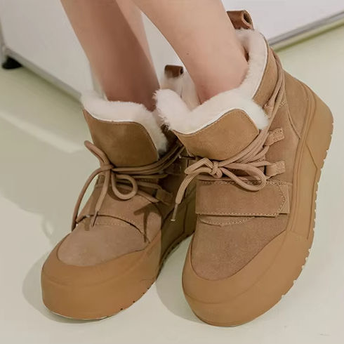 รองเท้าบูทหนังแท้สำหรับฤดูหนาวของ Ann ส้นสูง 6 ซม. บุขน ส้นหนา บุรองกันเสียดสี คุณภาพสูงสำหรับผู้หญิง ทรง Midi Arch